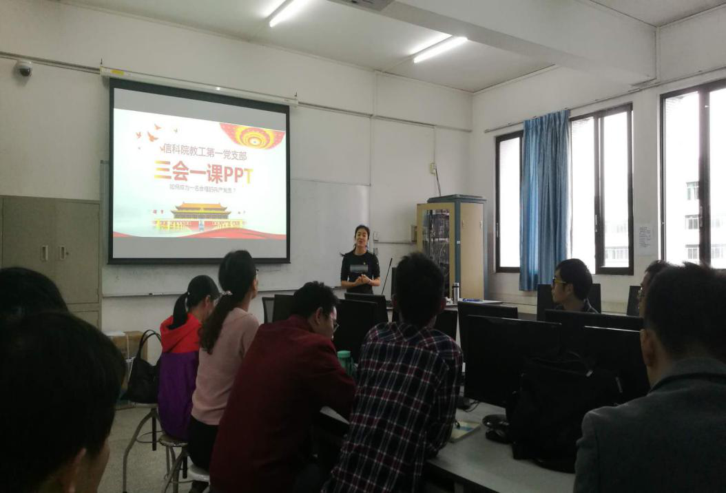 为深入推进“两学一做”学习教育常态化制度化,保持党员先进性,10月18日下午4点,信息科学与技术学院教工第一党支部书记王潇在英东楼702为支部全体党员上了一堂题为“三会一课”的主题党课。王潇就“三会一课”是什么,为什么要长期坚持“三会一课”制度,“三会一课”的作用是什么这三项内容进行了深入讲解。她强调,作为党内政治生活长期坚持的一项重要制度,“三会一课”制度对于支部组织力的培养、提升、发挥有着不可或缺的基础性作用,必须从严从实从细抓好。党的十九大发出坚定不移全面从严治党、不断提高党的执政能力和领导水平的动员令,只有“三会一课”制度抓严抓实了,才能使每个支部都“严”起来、每个党员都“严”起来,实现“全面”的“严”。因此,全面从严治党向党支部延伸,就必须严格“三会一课”制度。