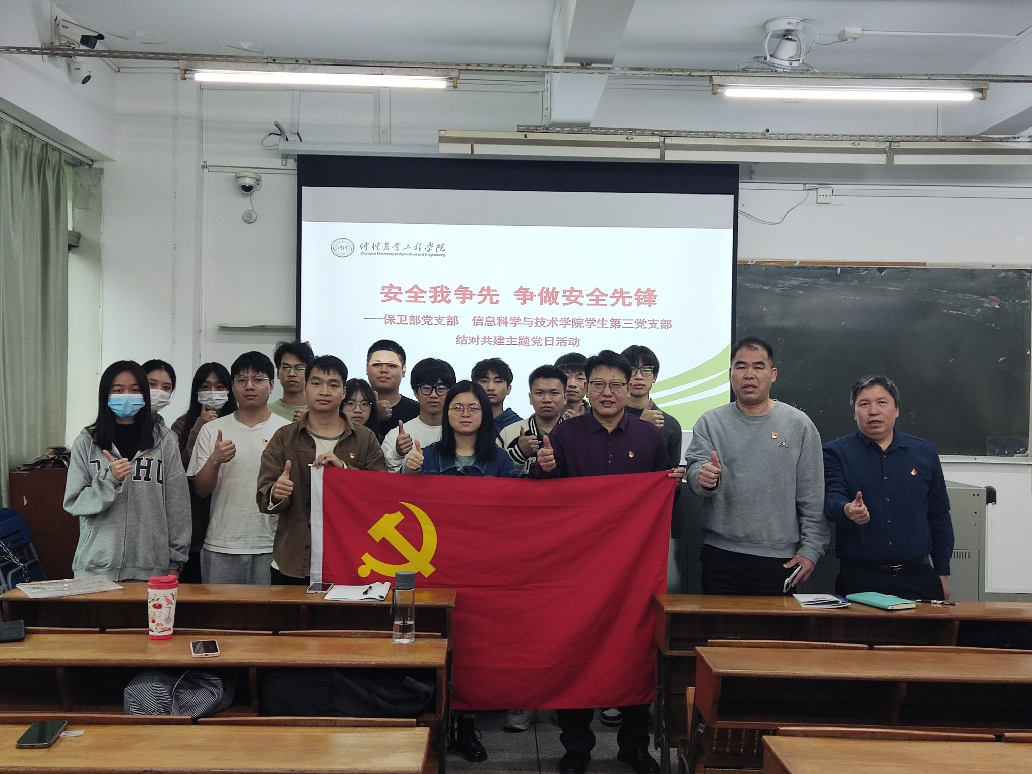 12月29日下午,信息科学与技术学院学生第三党支部与保卫部党支部共同举办联学活动。保卫部党支部书记、部长陈丹雄,副部长钟传钦,科长肖宏露,信息科学与技术学院学生第三党支部书记王双星,副书记陈健如及党支部学生党员参加活动。