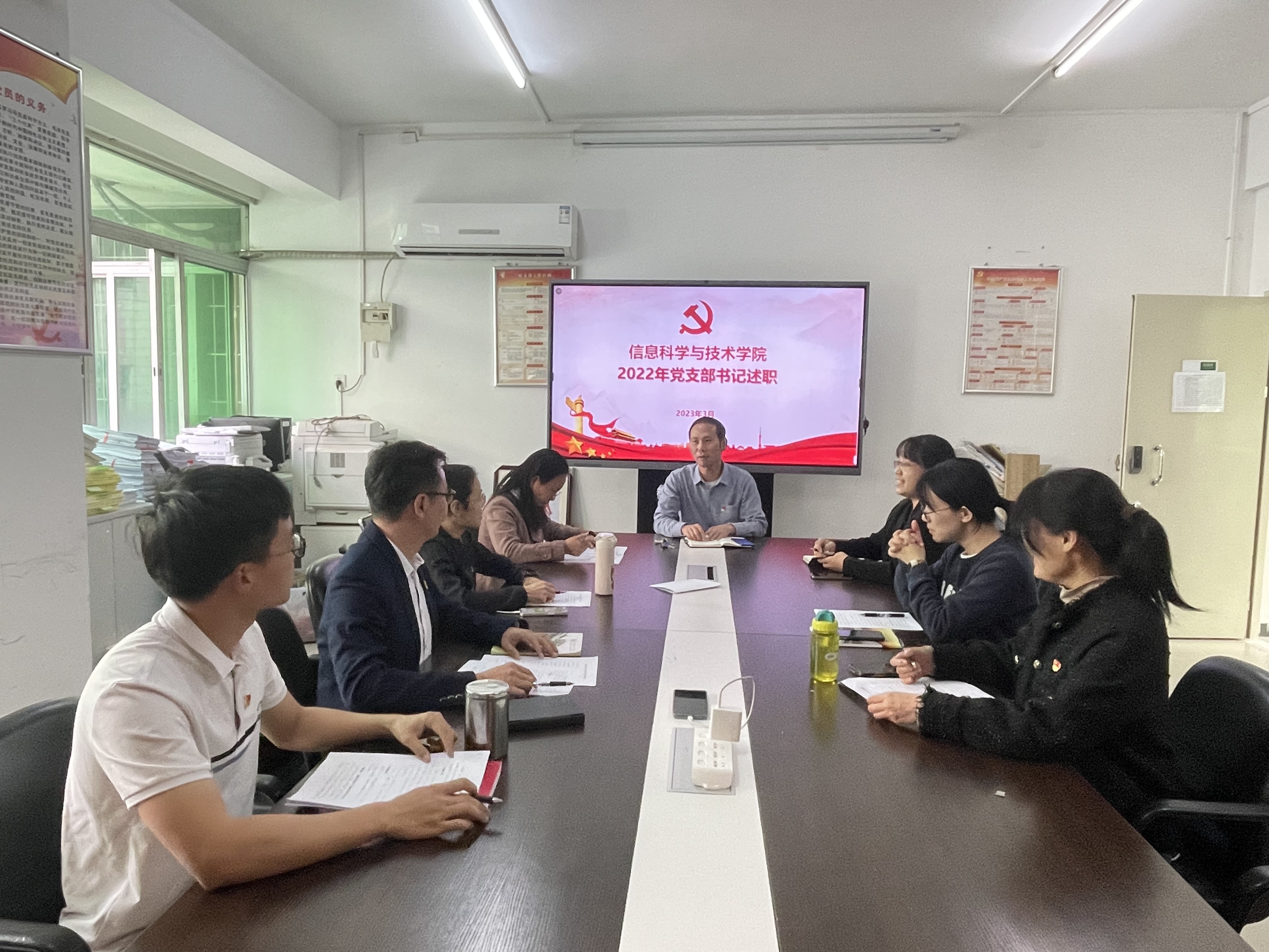 会上,七位教工党支部和学生党支部书记围绕党支部一年来的工作情况依次述职,分别从年度特色工作、履职情况、存在的主要问题和不足、改进工作的思路和举措等方面进行汇报。党委书记熊友华结合述职和平时掌握的情况逐一点评,肯定了各支部党建工作所取得的成绩和亮点,指出了各支部存在的问题与不足,同时对各支部抓好党建工作提出了明确的要求和具体的建议。他指出,2023年是全面贯彻党的二十大精神的开局之年,做好今年党建工作任务艰巨、责任重大。党支部是党在大学全部工作和战斗力的基础,一要扛起政治责任大旗,把政治建设摆在首位,把政治标准和政治要求贯穿于基层党建工作的始终。二要始终牢记筑牢堡垒,不断增强工作本领,着力促进党建和教研、学生工作等业务的深度融合,以高质量党建助推学院高质量发展。三要践行党内规章制度,贯彻民主集中制,严格按照党的组织原则和程序议事决策,在集思广益和聚力执行中不断提升党支部的领导水平。