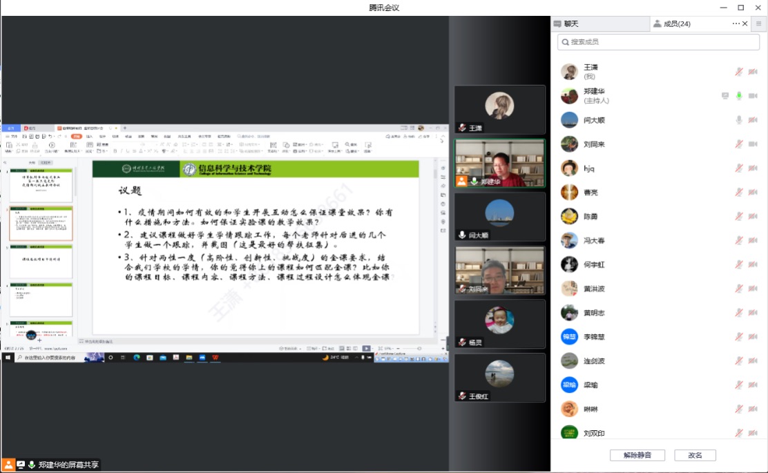 郑建华老师认为,老师们要转变观念,以学生为中心开展教学,充分利用现代化信息技术,积极采用多样化教学手段,注重过程考核,增强学生的参与感,同时要做好学生的学情跟踪。闫大顺和王俊红老师就如何准备丰富的线上教学资源、如何有效和学生开展互动、如何保证线上实验的教学效果等方面分享了自己的经验。王潇老师认为,开展线上教学的时候,不能只在乎课堂任务是否完成,也要注意到课堂教育效果,要融入教学情感,培养学生的情感、态度和价值观。其他老师也一一分享了自己开展网络教学的经验和收获,现场讨论氛围热烈。