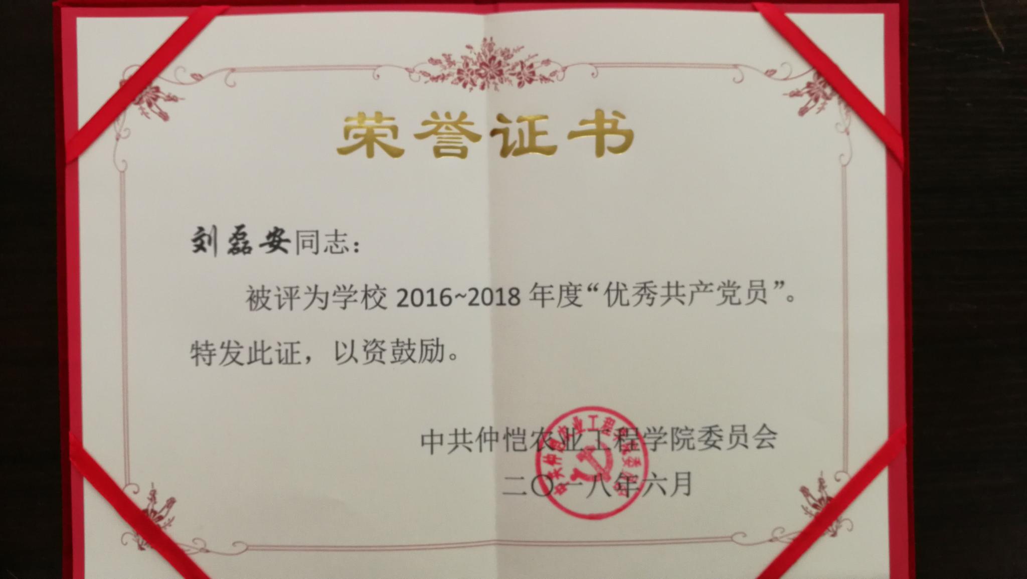 刘磊安同志获“优秀共产党”荣誉称号
