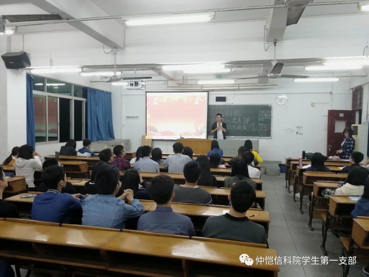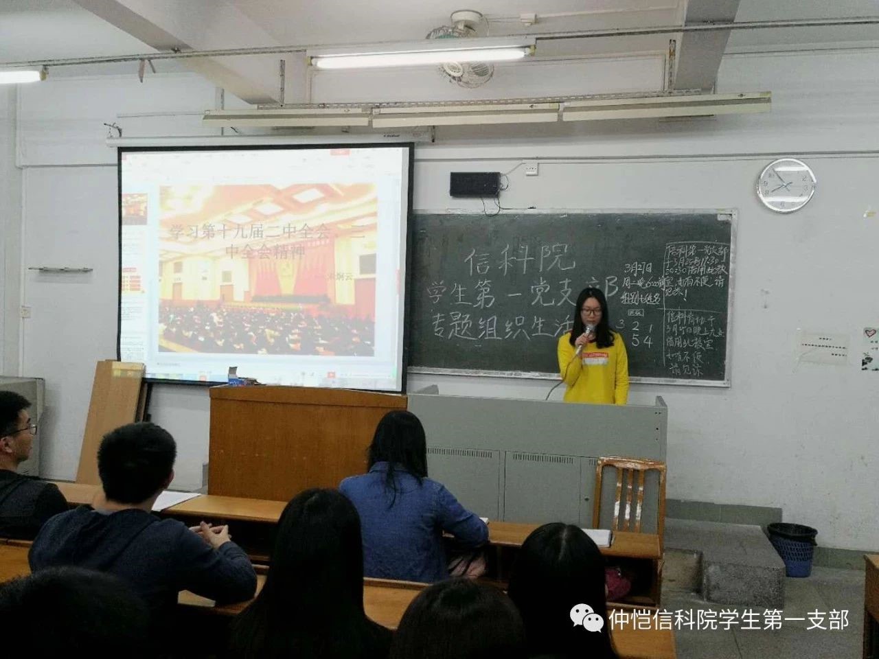 3月25日晚上,信息科学与技术学院学生第一党支部在教学楼209召开专题组织生活会,共同学习贯彻习近平主席在参加十三届全国人大一次会议广东代表团审议时的重要讲话精神,学习贯彻党的十九届二中、三中全会精神,分享交流支部同志在两会期间的学习成果。会议由支部组织委员郑瑞林主持。