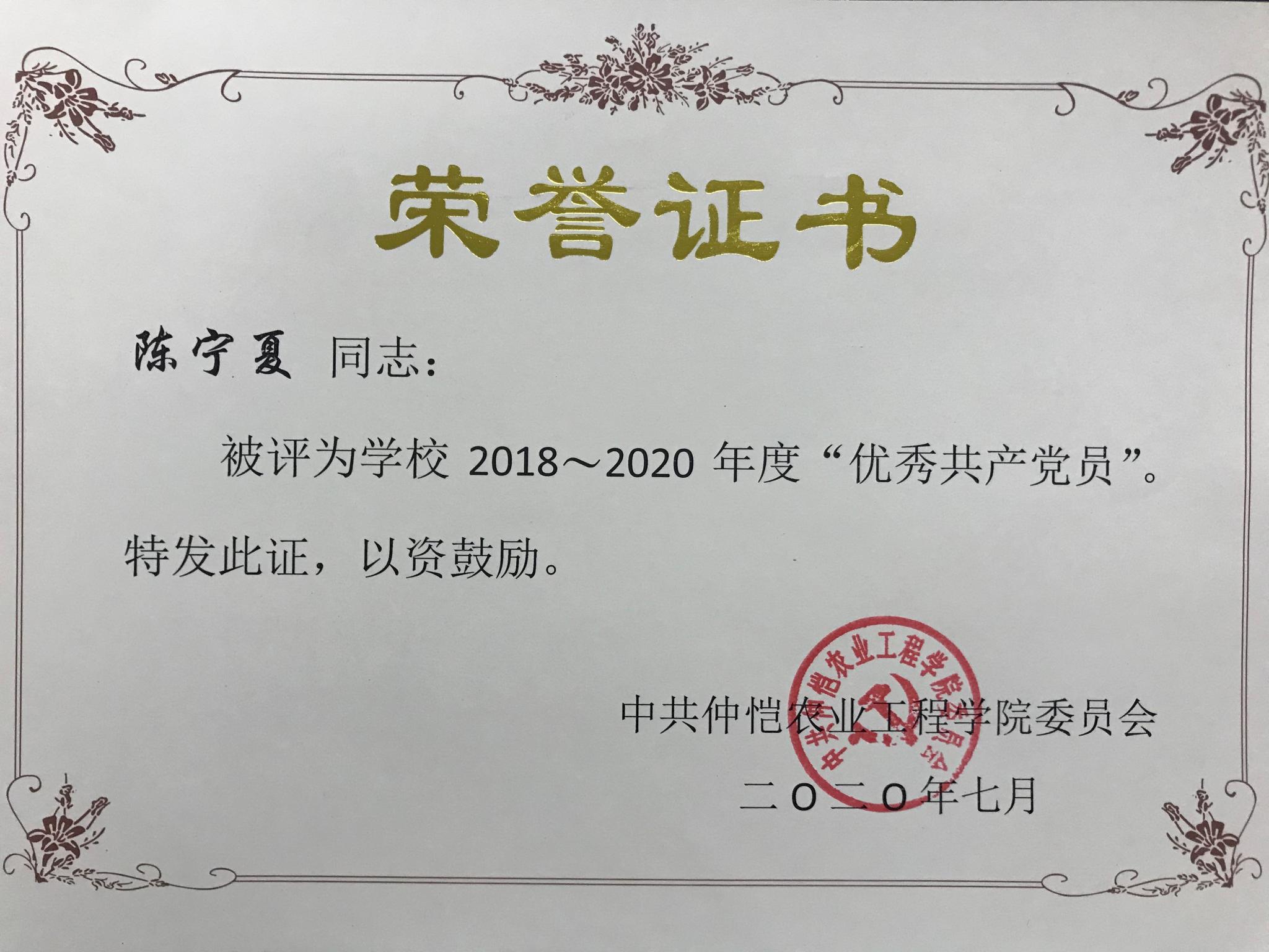 陈宁夏同志获2018—2020年度“优秀共产党员”荣誉称号
