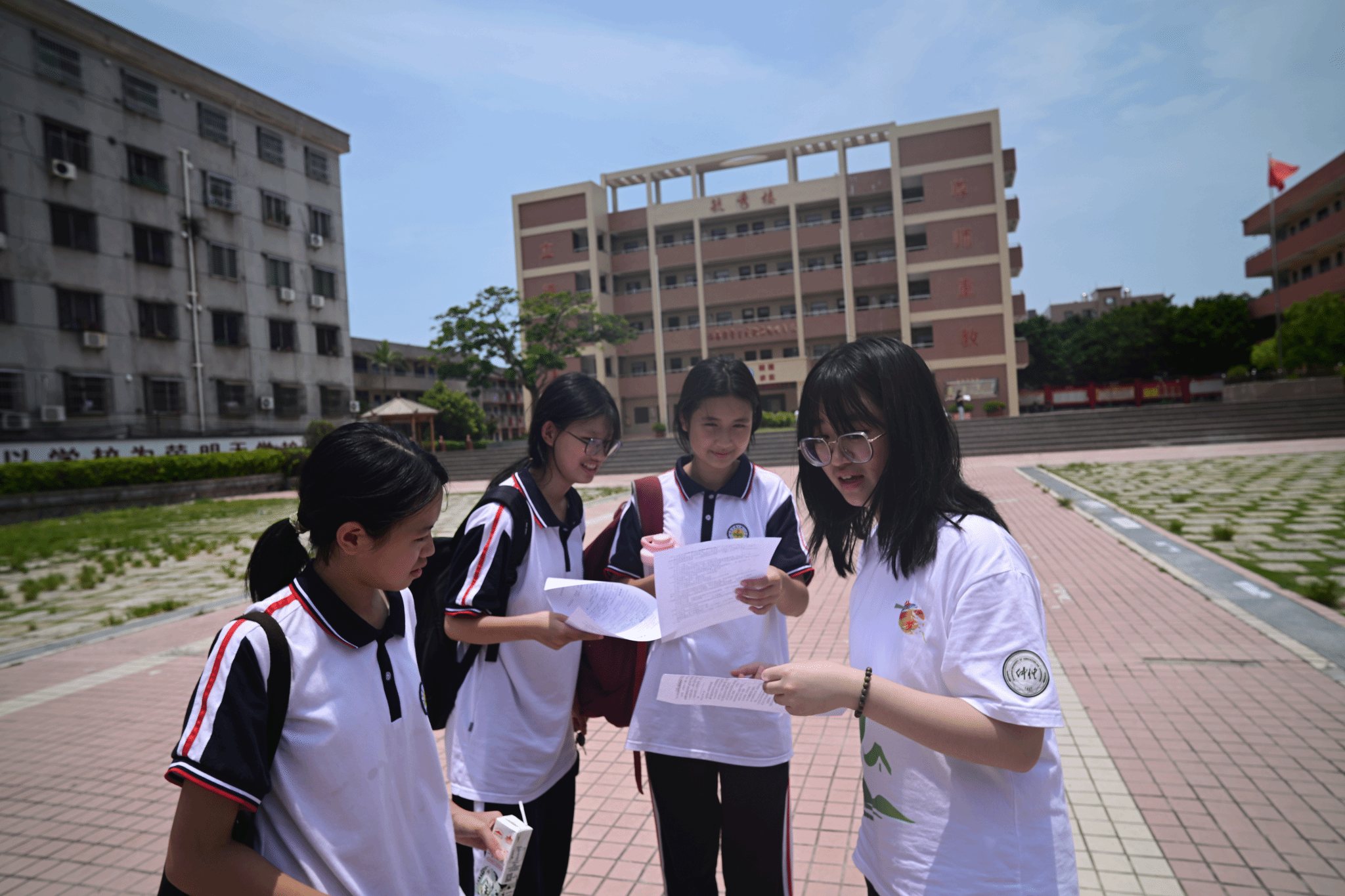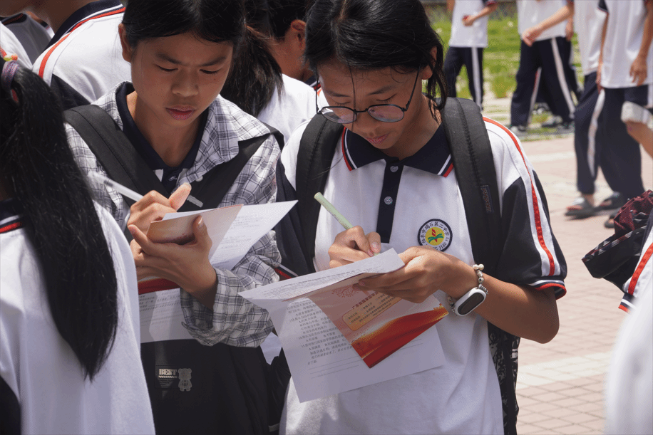 为了让校园里的学生更直观地了解资助政策,团队同时在汕尾市碣石第二中学摆摊设立“资助政策咨询点”,张贴宣传旗帜,向来往的学生和家长派发国家资助政策宣传手册、设置有奖问答互动、政策知识小游戏,形成"手册发放+现场答疑+游戏互动"三维模式开展精准宣传。