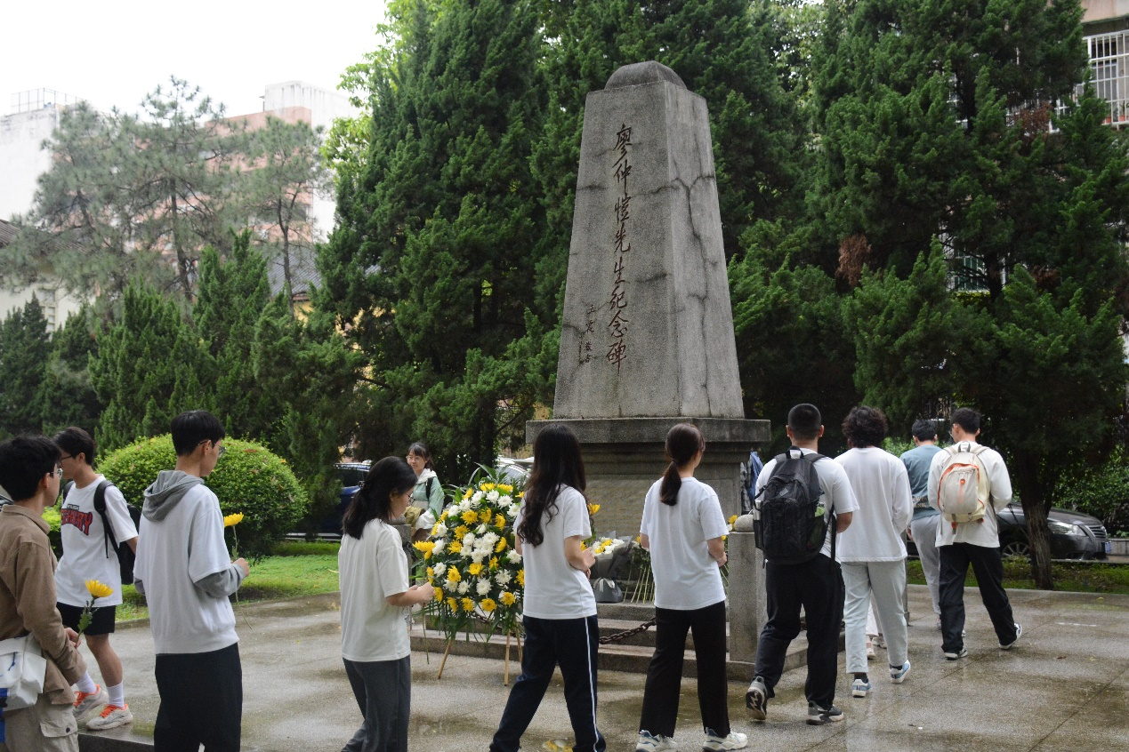 在廖仲恺先生纪念碑前,气氛庄严肃穆,全体师生党员手捧鲜花,肃立默哀一分钟,向革命先烈致敬。随后,全体师生肃穆而行,献上鲜花,表达对革命先烈的崇高敬意和缅怀之情