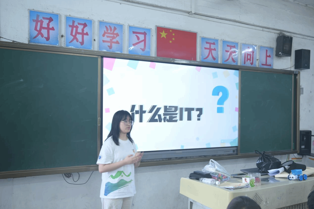 队员翁富彦、刘辉芃以动态爱心代码和拼图游戏点燃全场兴趣,生动阐明IT技术给个人、家庭、国家层面带来的改变。通过智能小车避障演示,他揭秘超声波测距(仿蝙蝠声波探路)与编程响应逻辑,学生屏息观察小车实时响应障碍物的过程,直观感受代码驱动硬件的神奇力量。