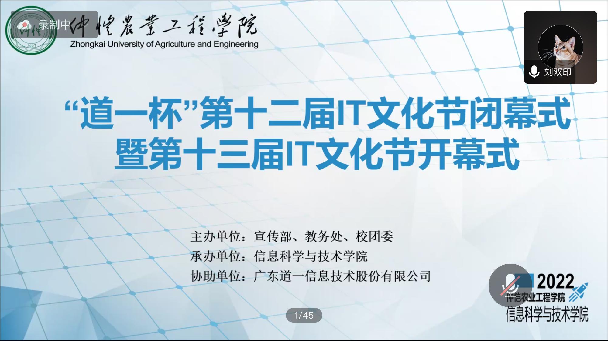 4月10日下午,仲恺农业工程学院“道一杯”第十二届IT文化节闭幕式暨第十三届IT文化节开幕式以线上形式在云端举行。信息科学与技术学院院长刘双印、副院长刘磊安、副院长杨灵、IT文化节各项目负责老师和参赛学生代表参加,活动合作单位广东道一信息技术股份有限公司人力资源部总经理助理罗艳、校园招聘负责人也应邀出席。活动由刘磊安主持。