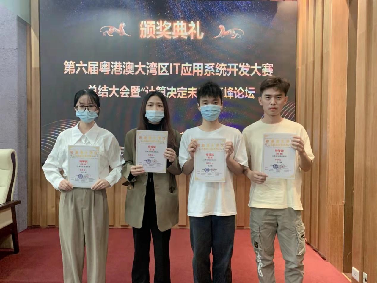 本届粤港澳大湾区IT应用系统开发大赛,由广东省高性能计算学会承办,香港青年IT网络、澳门国际科技产业发展协会、粤港澳大湾区科技协同创新联盟共同主办,广州市港澳办、广州市科协、深圳市科协、广州市工信局、共青团广州市委共同指导。2021年,第六届粤港澳大湾区IT应用系统开发大赛共在11座城市设立了12个赛区,报名参赛人数1514人,带来了794个参赛项目,覆盖高校47所,353名专家和老师参与了项目作品指导。我院21级研究生谢杰锋、物联网工程192班李思颖、计算机科学与技术192班罗婉婷和曾志帆四名同学组成的参赛团队提交了“光禽贴标溯源系统”参赛项目,在荣获广州赛区一等奖的基础上晋级总决赛,队员们再接再厉,最终在794个参赛项目中脱颖而出,荣获总决赛的特等奖(铜奖)。