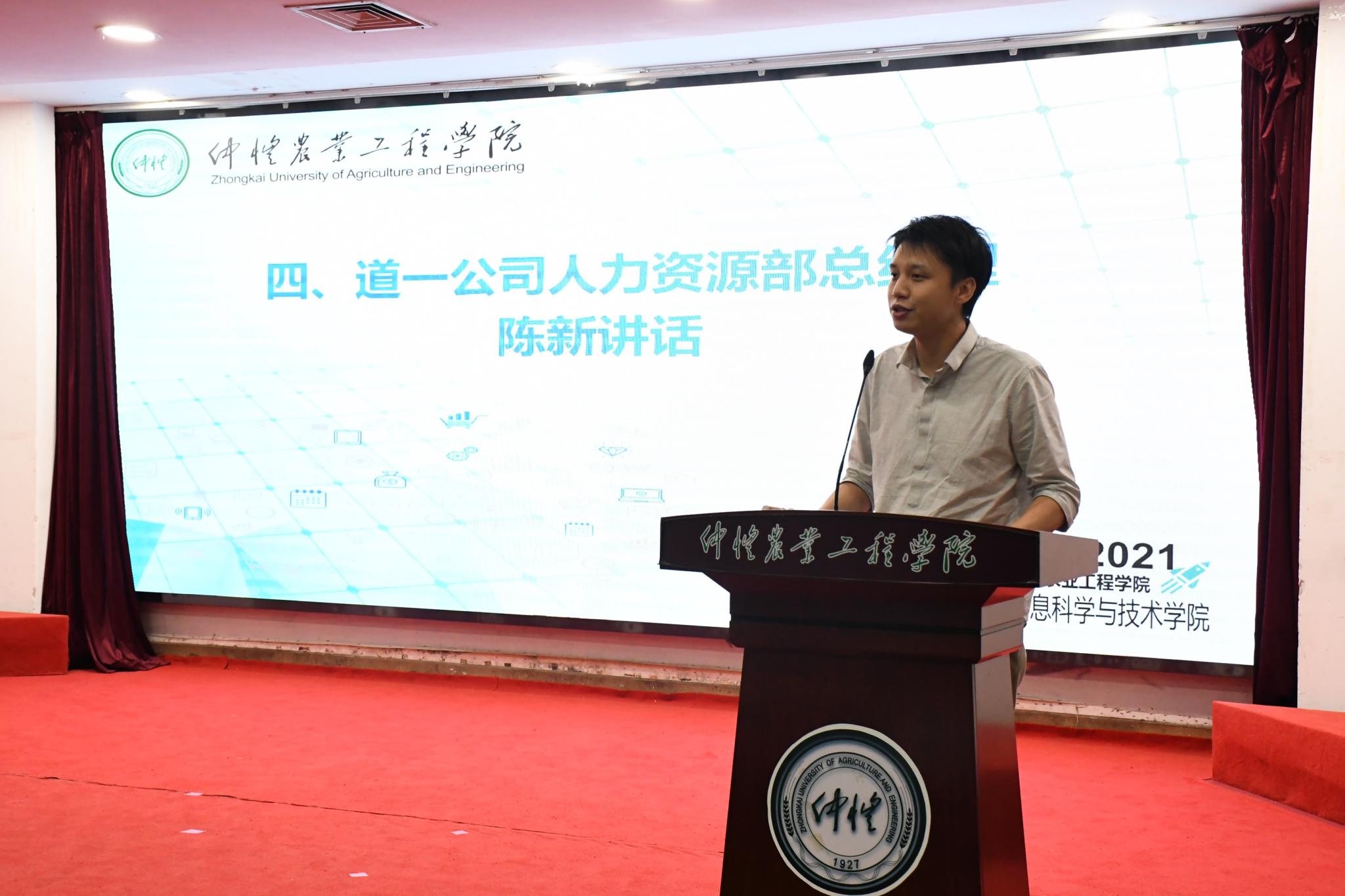 广东道一信息技术股份有限公司人力资源部总经理陈新介绍了公司的发展历程和基本情况,希望继续推进好与学校在实习招聘、人才培养等方面的合作,共同搭建校企合作桥梁,促进校企资源的整合共享和有效对接。对于本次IT文化节,他希望通过竞赛平台发现和挖掘优秀的学生,提供实习和实践机会,在宣传企业文化的同时,吸引更多在校生了解和加入道一公司。