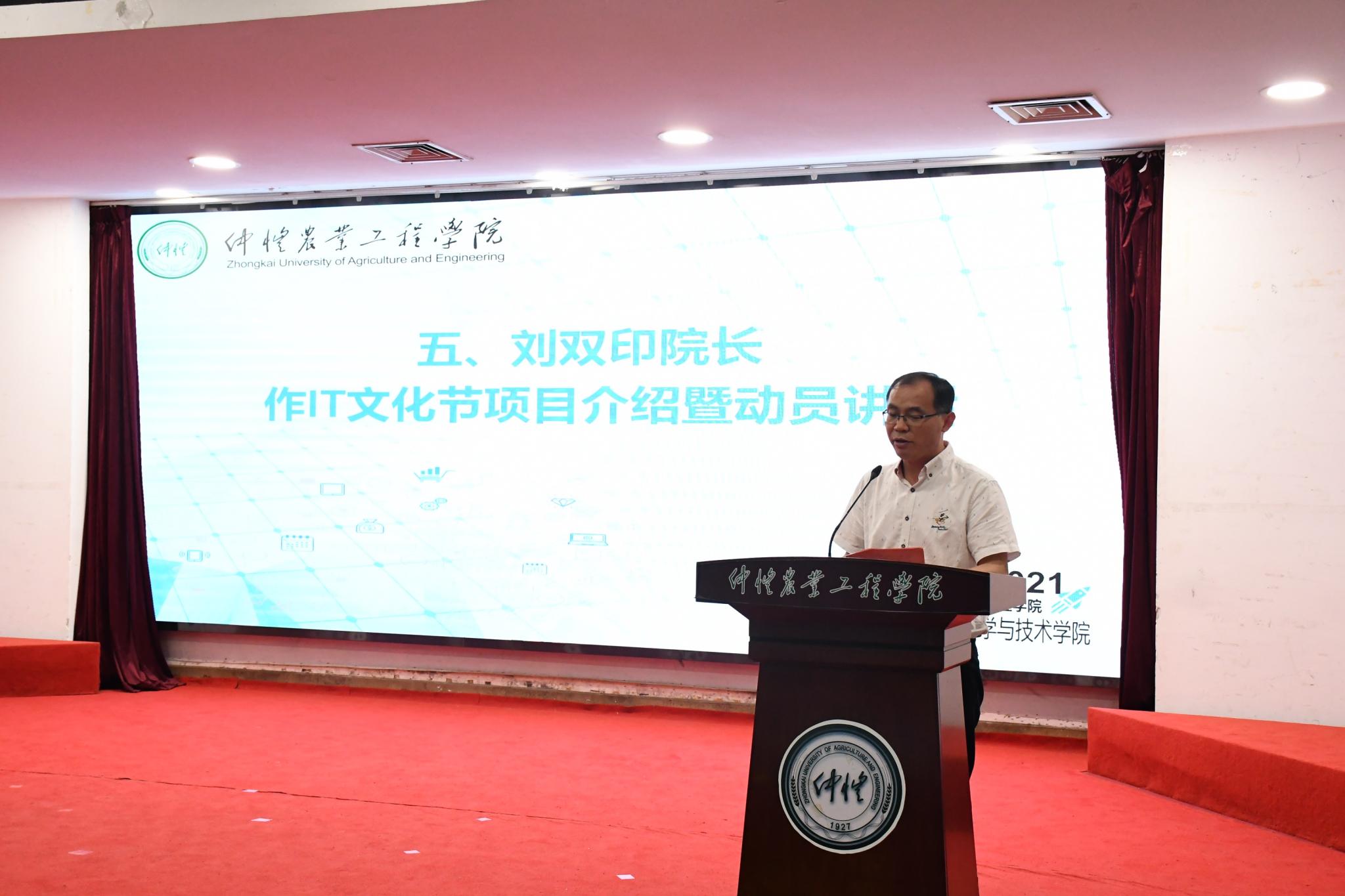 最后,我院刘双印院长作IT文化节动员讲话。他介绍了IT文化节的举办目的和各子项目的调整情况。他强调,学院一直以来都高度重视学科竞赛在创新创业人才培养工作中的重要作用,不断完善和优化文化节的项目类型和赛事内容,并鼓励参赛选手跨班级、跨年级、跨专业、跨学院组队,以培养多学科交流融合的学术素养、综合技能和创新能力。他还提到,今年学院与广东道一信息技术股份有限公司正式签订合作协议,就学生实习实践,联合培养技术人才等方面开展深入合作,实现人才共育、成果共享,希望同学们都能积极参赛、认真备赛,借助校企合作实践平台,了解相关行业工作经验和前沿信息,在比赛中收获技能和实战经验。