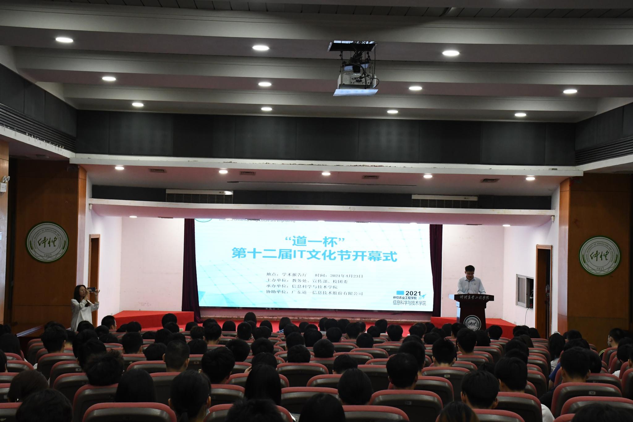 4月23日下午,仲恺农业工程学院“道一杯”第十二届IT文化节开幕式在海珠校区学术报告厅举行。学校团委书记熊友华、教务处副处长洪维嘉、宣传部副部长龚慧枫出席。我院院长刘双印、党总支副书记史孔仕、文化节各项目负责老师和学生代表参加。本次开幕式还邀请到合作单位广东道一信息技术股份有限公司人力资源部总经理陈新、校园招聘负责人出席。开幕式由学院党总支副书记史孔仕主持。