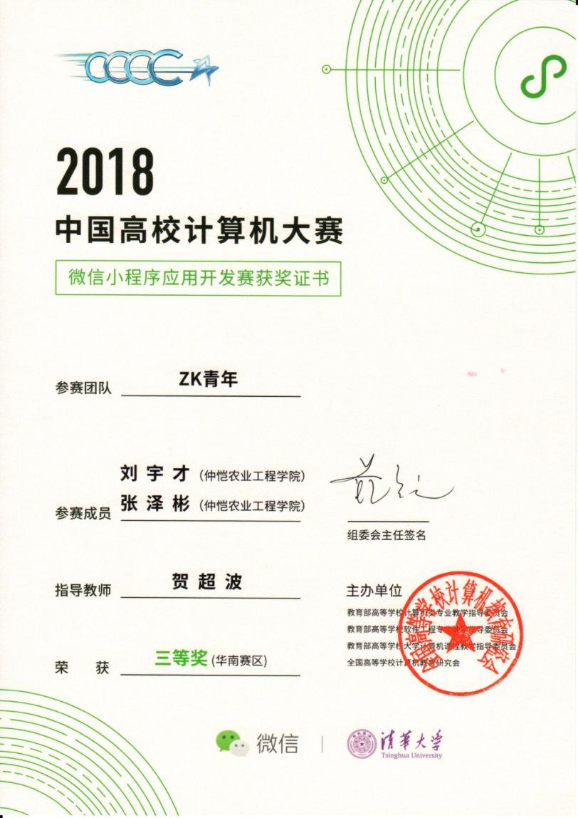 近日,2018中国高校计算机大赛——微信小程序应用开发赛组委会公布获奖名单,信息科学与技术学院的参赛团队ZK青年(成员:刘宇才、张泽彬,指导老师:贺超波)报送的作品《掌上一六》获得华南赛区三等奖。