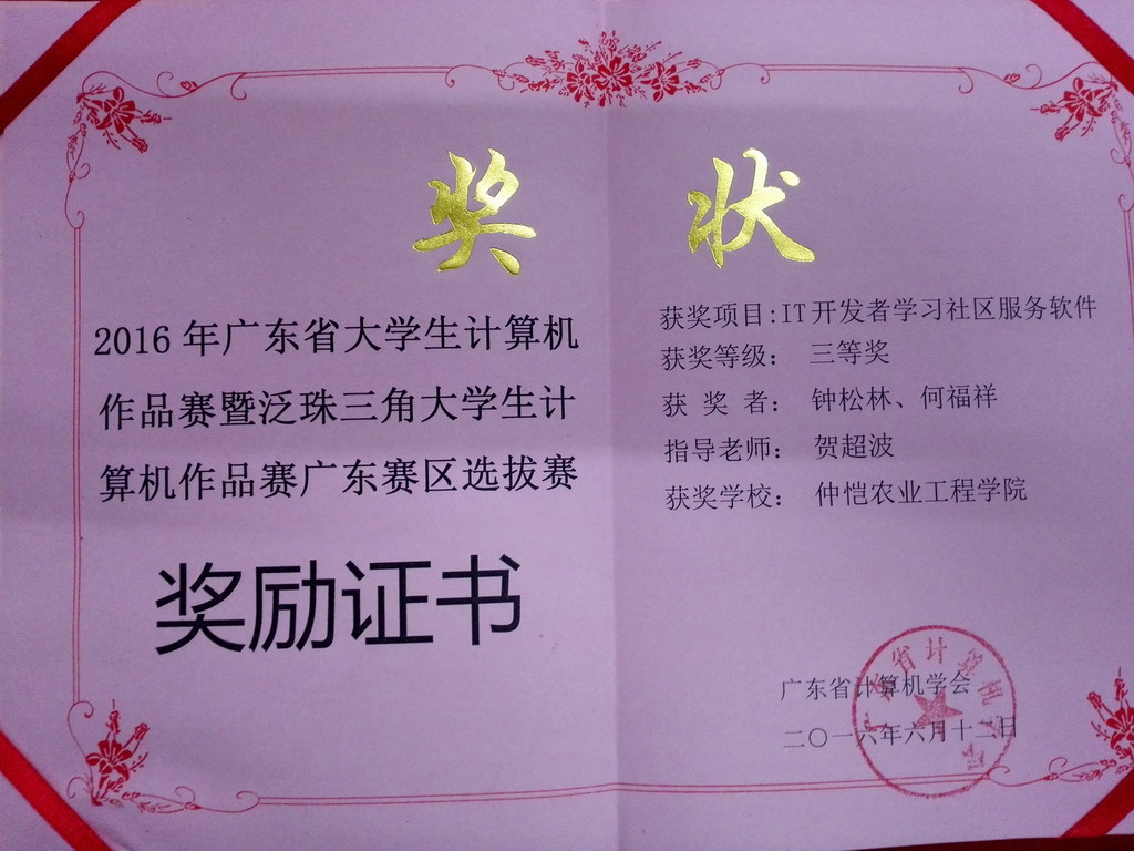 2016“华资杯”广东省大学生计算机作品三等奖