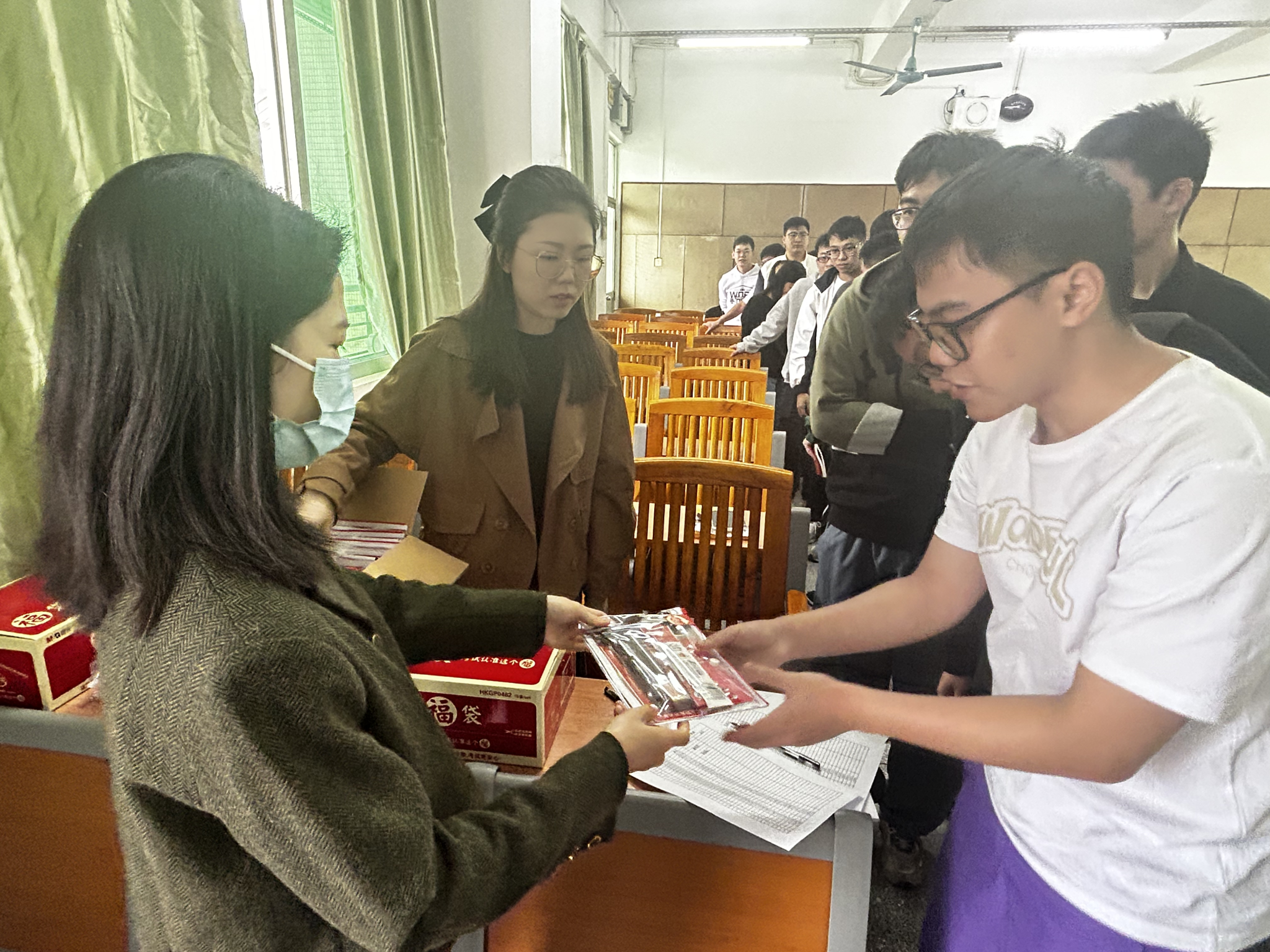 年级辅导员聂淑玲、许嘉林为考研学子赠送考研文具大礼包,勉励同学们:星光不负赶路人、时光不负有心人。希望同学们能够放平心态,继续努力,坚持到底,以最好的状态全力以赴,考出最佳水平。