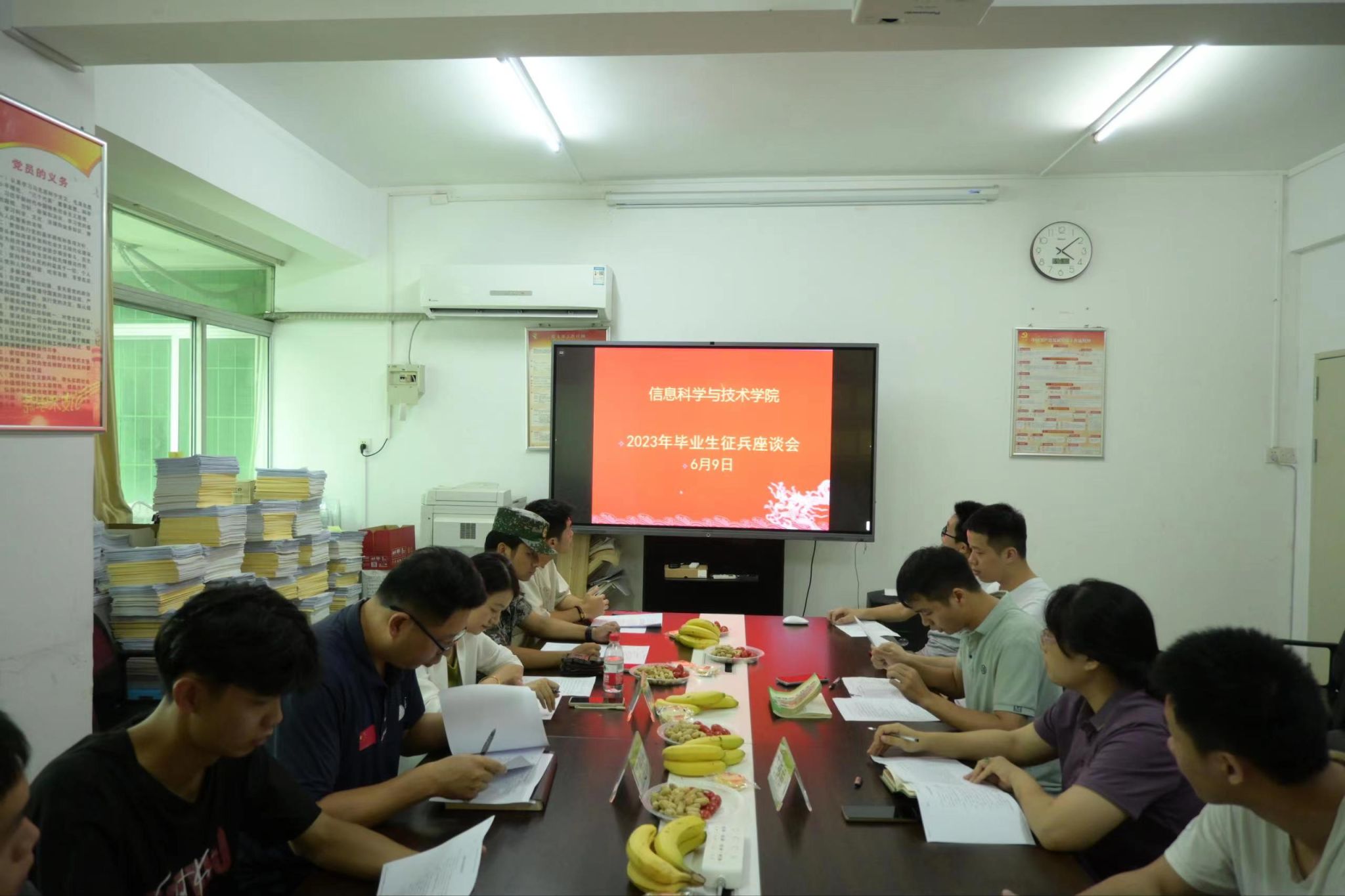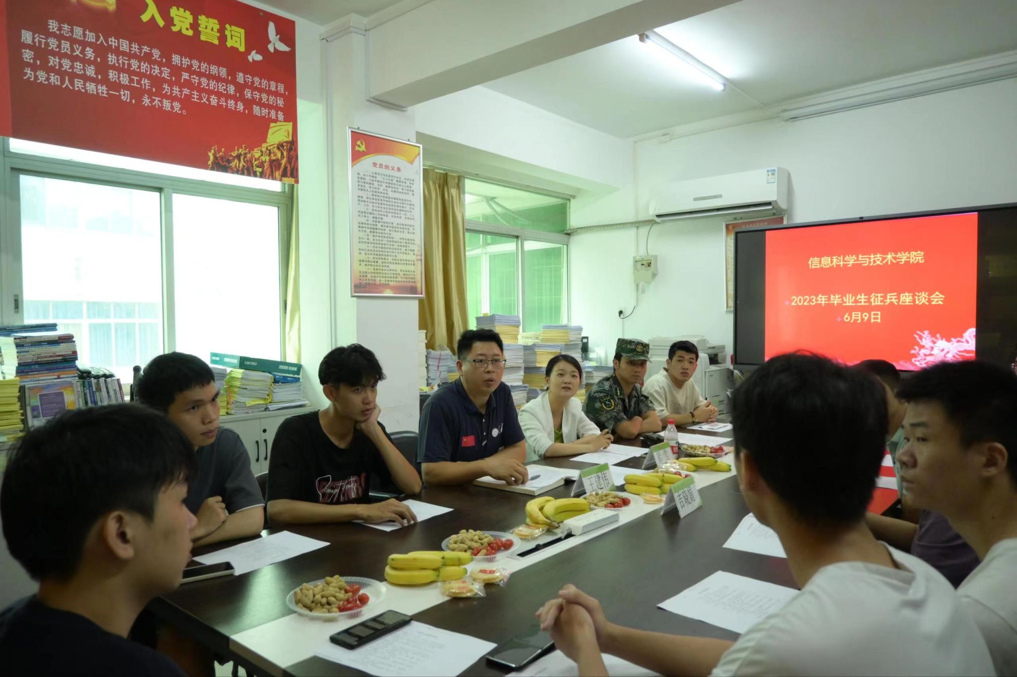 6月9日下午,信息科学与技术学院在教学楼312会议室召开2023年毕业生征兵座谈会。学生工作部、人民武装部副部长王建伟,学院党委副书记吉晓娟,征兵与退伍事务岗熊雪,辅导员王双星老师以及目前信科院已经报名参加入伍的毕业生出席了本次会议。