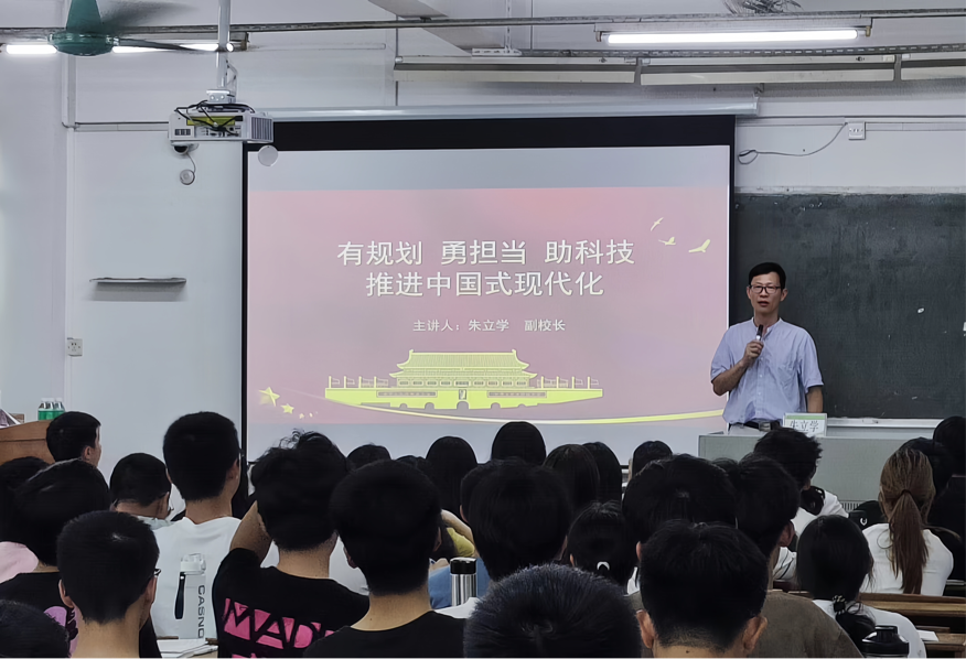 10月20日下午,党委常委、副校长朱立学以《有规划、勇担当、助科技推进中国式现代化》为题,在海珠校区教学楼209为信息科学与技术学院计算机231-233班学生开讲思政第一课。