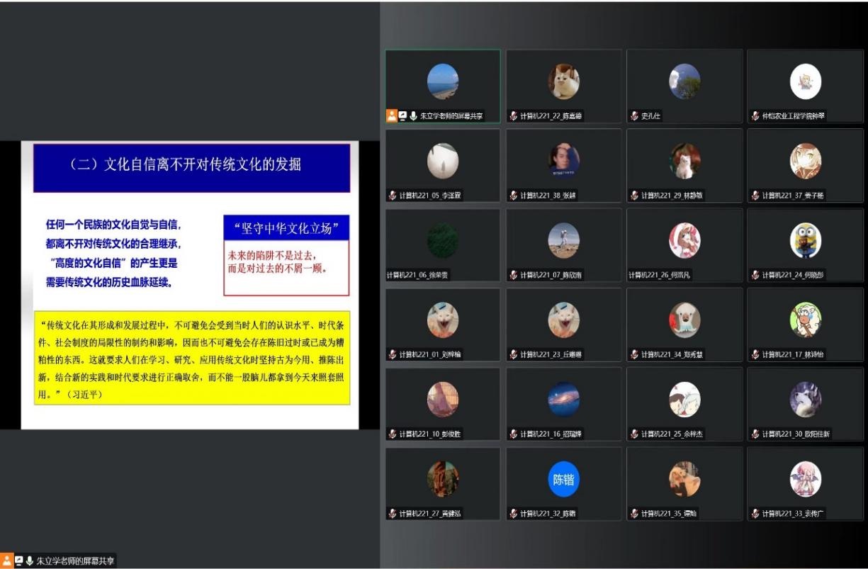 课堂上,朱立学副校长以《推进文化自信自强 铸就社会主义建设新辉煌》为主题,结合党的二十大报告从三个方面展开叙述:一是文化自信提出的时代背景。他“五个关键词 ”道出文化自信离不开文化强国、文化产业,文化软实力,文化体制改革,社会主义核心价值观的支持。二是文化自信的内涵及其与传统文化、西方文化及社会主义核心价值观的关系他深刻阐释了文化自信的丰富内涵,从传统文化的“六大特点”提出文化自信离不开传统文化的挖掘,深入剖析文化传播的特点和文化自信与社会主义核心价值观之间的紧密联系。三是推进文化自信自强,铸就社会主义文化新辉煌的思考。从文化发展的现状入手,他指出我国文化发展取得了毋庸置疑的成就,为进一步满足人民日益增长的美好生活的需要,要清醒认识尚需加强之处。他强调,要始终坚持把社会利益和经济利益相统一、要牢牢掌握党对意识形态工作领导权、要以科学自信的态度汲取传统文化和西方文化精华、要推动文化体制改革在新的起点上纵深扩展、要夯实文化自觉自信的物质基础、要始终培育和践行社会主义核心价值观。