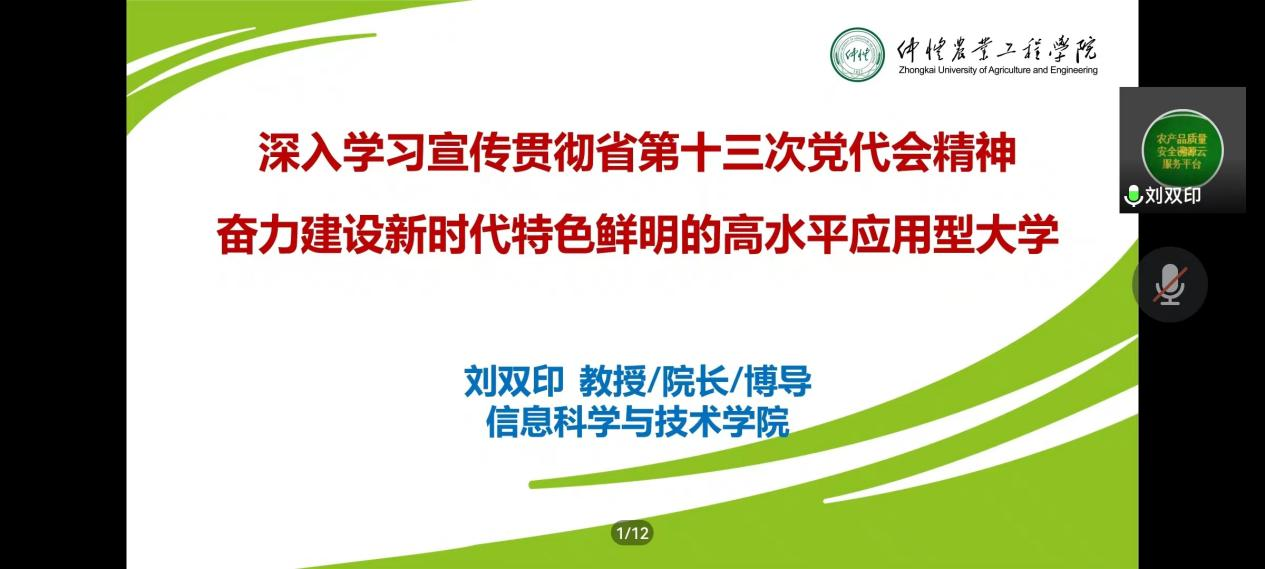 7月22日上午,学院在腾讯会议APP开展学习贯彻省第十三次党代会精神宣讲活动,刘双印院长担任主讲,学院全体学生党员参加。会上,刘双印简要介绍了广东省第十三次党代会情况,强调这次大会是一次忠诚拥护“两个确立”、坚决做到“两个维护”的大会,他带领大家学习了过去五年广东省取得的十大成绩和历史经验,以及今后五年工作总体要求和主要目标,并详细解读了深化“1+1+9”工作部署,介绍了今后五年九项重点工作任务,使大家深刻领悟广东省第十三次党代会精神。