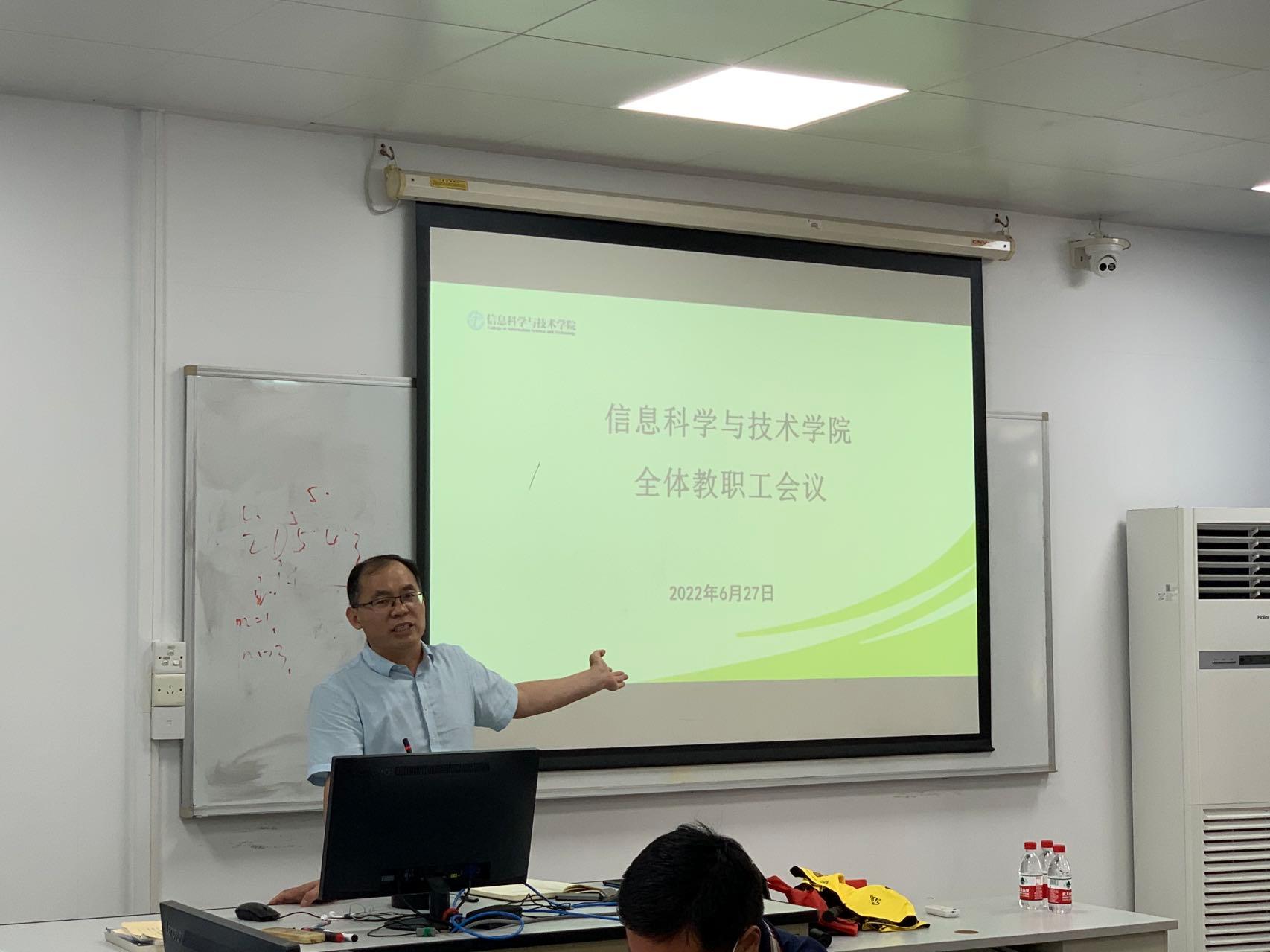 6月27日下午,信息科学与技术学院召开全院教职工大会,深入学习贯彻中国共产党广东省第十三次代表大会精神,安排部署学院近期重点工作。院长刘双印,党委副书记史孔仕,副院长杨灵、刘磊安及学院教职工出席了本次会议。大会由史孔仕主持。