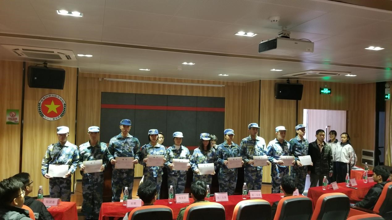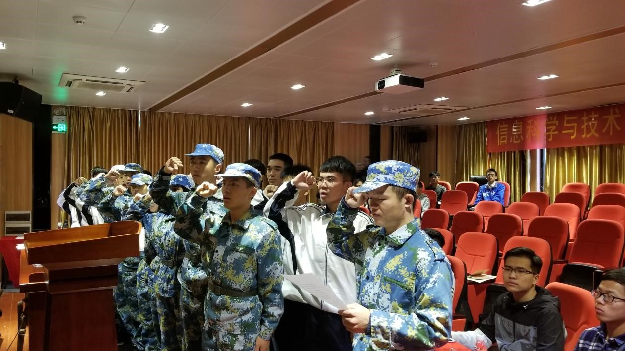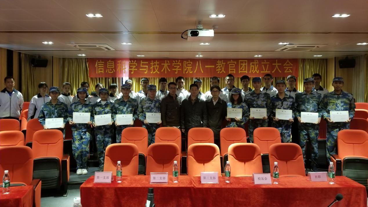 会议开始,王浩副书记宣读信息科学与技术学院八一教官团干部任命书,由吴家培书记为教官团干部颁布聘书,紧接着学生干部上台受聘并合影留念!