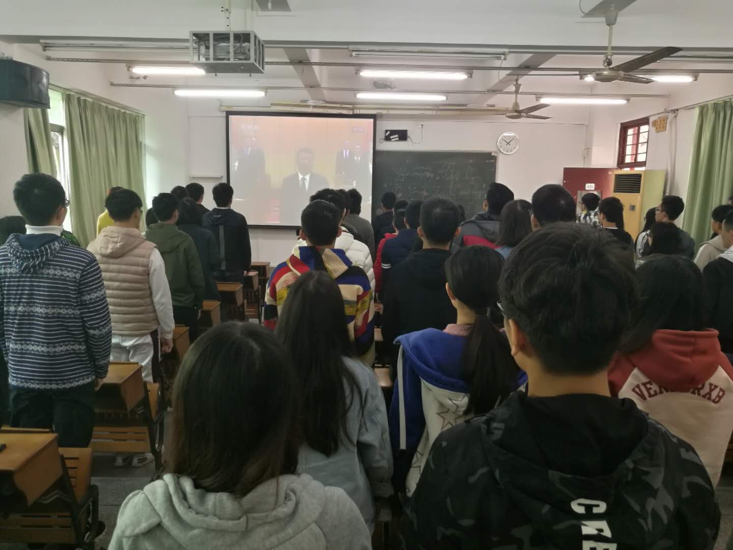 国歌响起,全体学生主动起身肃立,奏唱国歌。礼毕,大家认真观看直播视频,学习领会习近平总书记的重要讲话精神。看到国家在短短的四十年内,发生了如此翻天覆地的变化,同学们备受鼓舞,充满了民族自信心和自豪感,观看现场不时响起热烈的掌声。