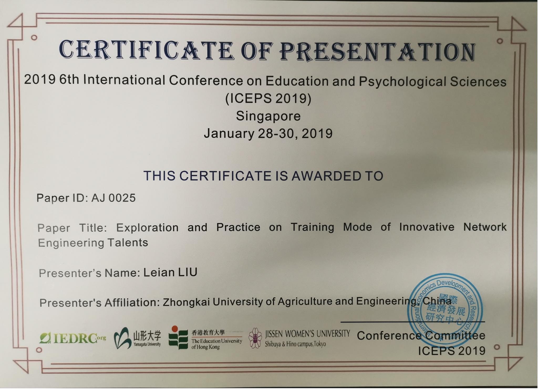 2019年1月28日至30日,我院副院长刘磊安参加了在新加坡举办的2019 6th International Conference on Education and Psychological Sciences(ICEPS 2019),并在该会议上作了关于论文“Exploration and Practice on Training Mode of Innovative Network Engineering Talents”的报告:“Six in one”,Boosting the cultivation of innovative ICT talents。