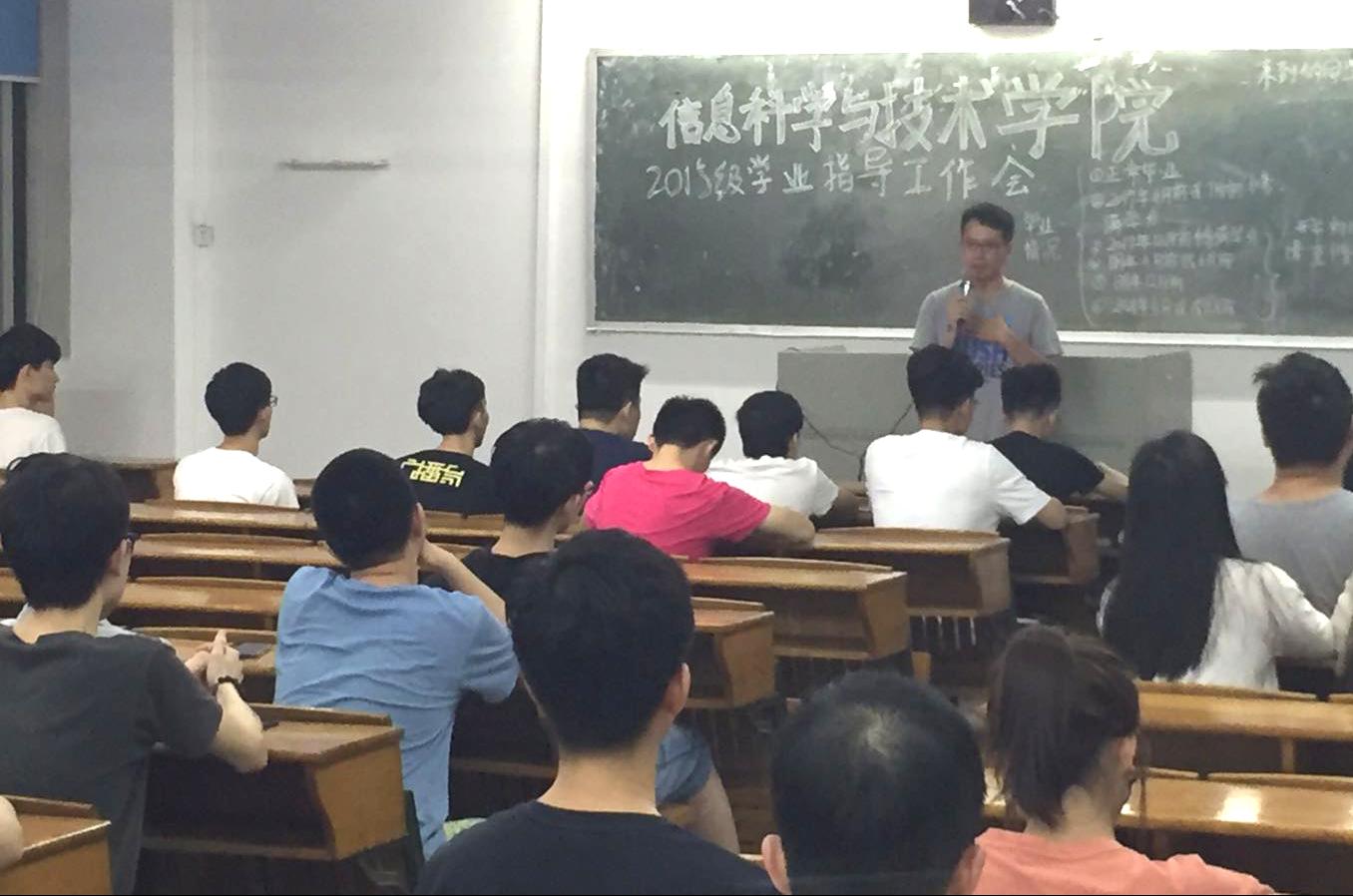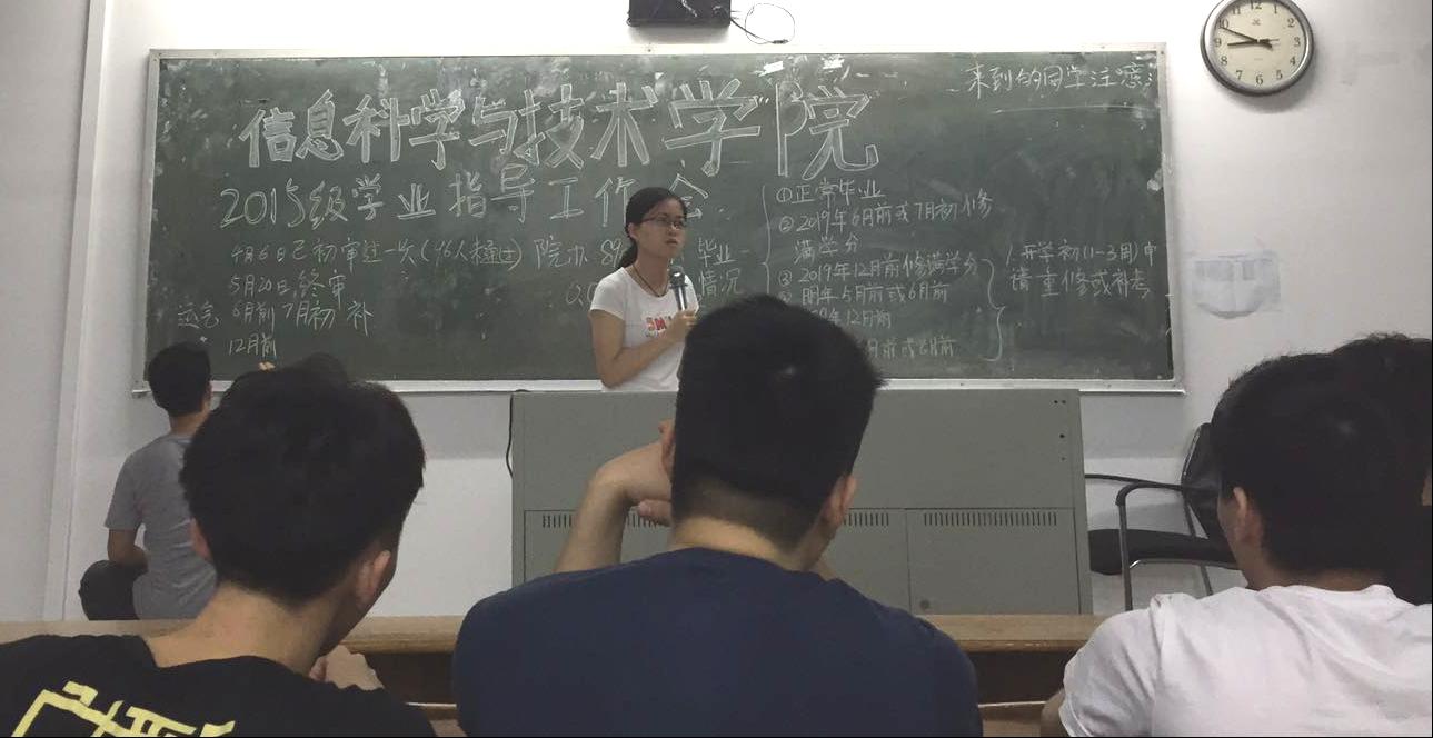 4月24日晚,信息科学与技术学院在教学楼309召开了2015级学业指导会,由辅导员吴南生、教务员陈健如主讲,毕业班90多位学业进展缓慢的同学参会。