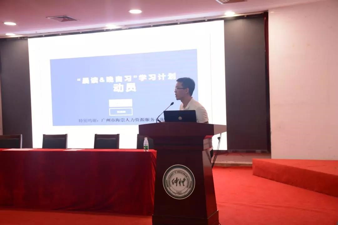 19级辅导员田旭峰则向大家详细介绍了我院晨读晚自修活动,动员学院所有人积极参与到活动中来,在坚持中学会自我规划和自我管理。会上还表彰了上一学年晨读晚自修活动的积极份子,并颁发了奖状和奖品。
