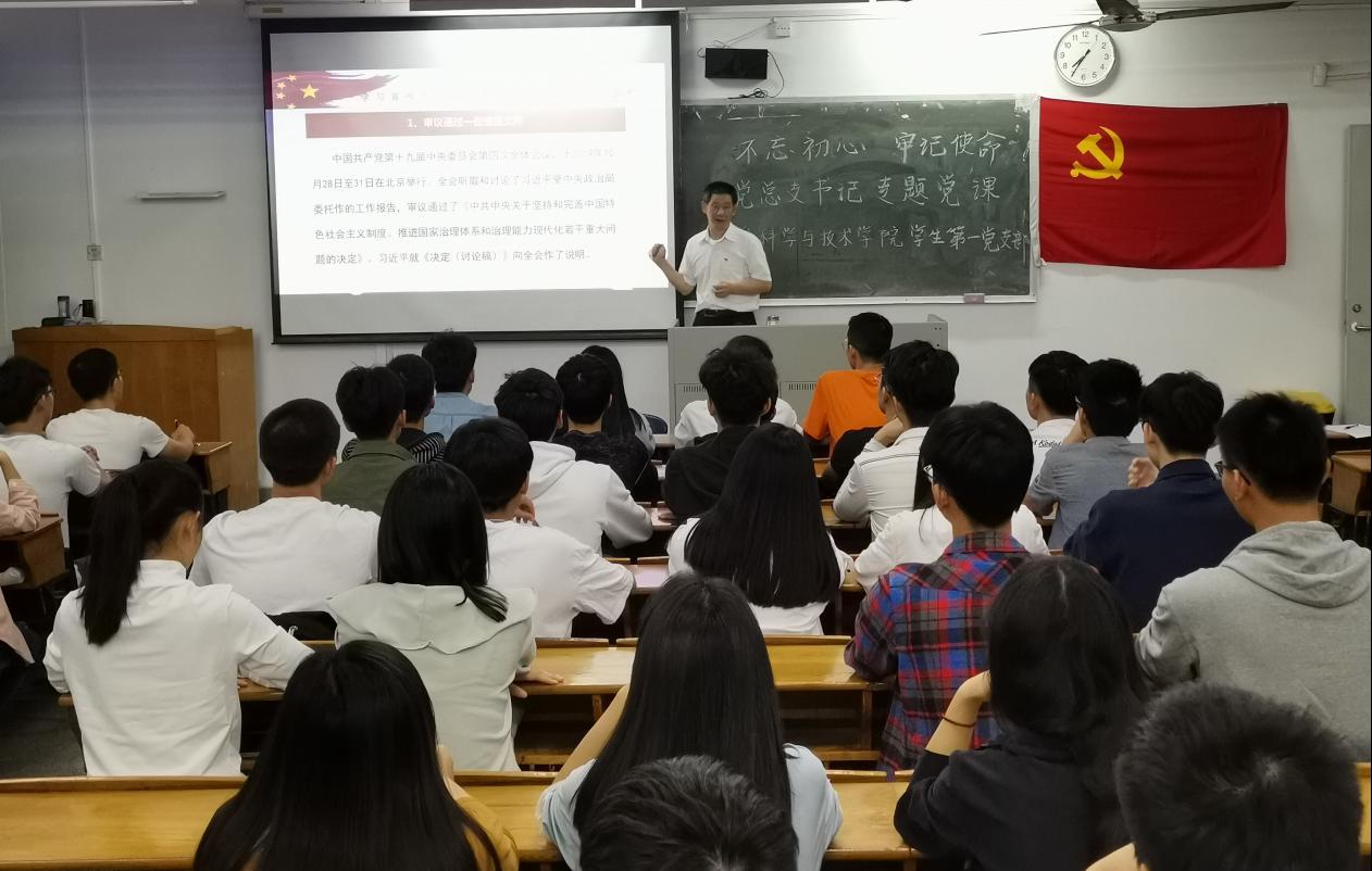 随着“不忘初心,牢记使命”主题教育工作的扎实开展,11月25日晚上,我院党总支书记吴家培在教学楼308为学院学生第一党支部开展“不忘初心、牢记使命”专题党课,支部全体党员、积极分子参加,党课内容为“学习宣传贯彻党的十九届四中全会精神”。