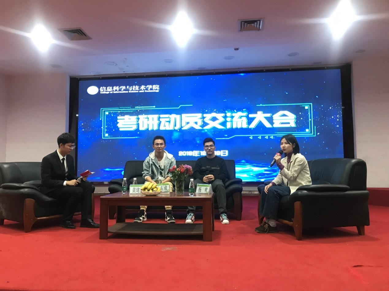 12月19日晚,我院在学术报告厅举行了考研动员交流大会,大会主要面向17、18级学生。2019届校友、考研优秀学生代表赖东成、杨欢、黄建德分享了考研心得。