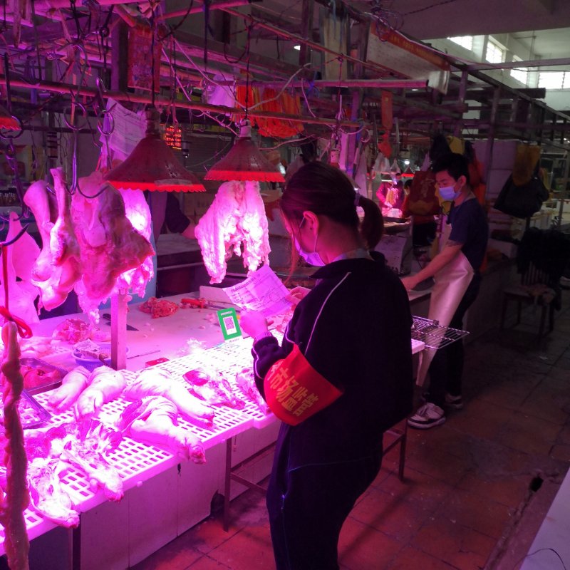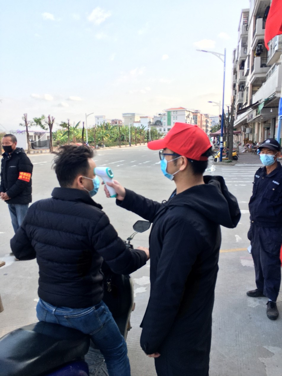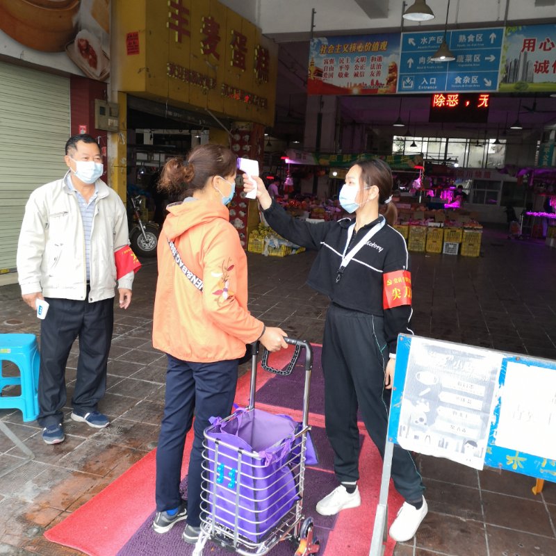 作为一名退伍军人,同时也是一名入党积极分子的朱奕莹,在居住地农贸市场对行人进行体温检测。市场是人流量最多的地方,稍有不慎就可能人传人以致感染上病毒。她奔赴一线,对进出人员一丝不苟检测体温,同时也记录各摊位的摊主身体状况等相关数据。希望自己能够为国家分担一下工作,并始终坚信这场灾难很快就会过去,我们一定会胜利的。