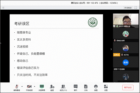 为加强低年级学生对考研的了解,激发他们的报考热情,营造积极向上的学风,学院于3月20日在腾讯会议上举办了考研经验交流和动员会。交流会邀请了我院毕业的中山大学在读研究生赖东成,他结合自己的经历给同学们分享了自己的考研心路历程和在备考期间应注意到的问题,包括提前确定目标院校、坚持自己选的专业,以及考研心态上的调整。交流会持续在线人数213人。