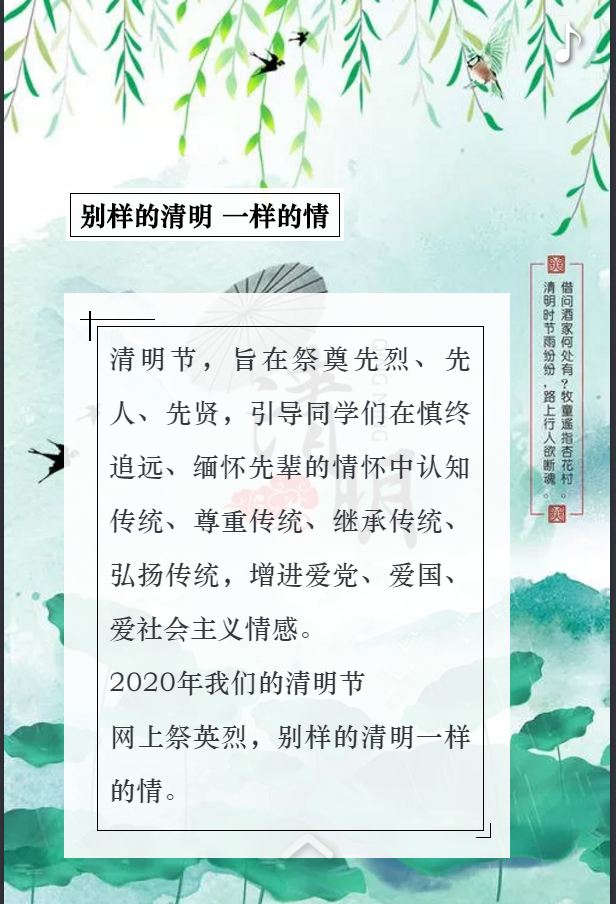 2020年的清明节是别样的清明,少了些许鞭炮的声响,但对先烈、英雄敬佩的情感永不缺席。无论是旧时奔赴沙场挥剑抗敌的他们,还是今日奔赴一线帮助抗疫的他们,我们都怀着敬佩与感激之情,感谢他们在国难当头时奋不顾身冲在前,把生命献给了我们脚下这边土地,留了一个个名字,一行行事迹,流淌不息的时间长河冲不淡我们对他们的尊敬。