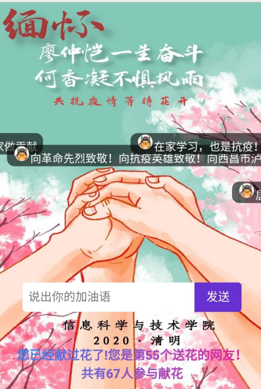 疫情下学生“开学不返校”,但学生教育常做常新,为了做好“云”教育,“云”育人,为了实现祭奠先烈、先人、先贤,引导同学们在慎终追远、缅怀先辈的情怀中认知传统、尊重传统、继承传统、弘扬传统,增进爱党、爱国、爱社会主义情感,我院在清明时节组织了以“别样清明一样情”为主题的“云”祭英雄活动,组织同学们通过各种途径对革命先烈、抗疫英雄及救火英雄的崇高敬意:一是组织同学们观看线上直播全国性悼念活动,通过在家中进行默哀的方式表达对在抗疫中牺牲的英雄及同胞以哀思;二是通过参加学生处组织的易班网上清明祭奠活动,在易班上书写对先烈英雄的感言寄语;三是通过秀米H5制作“居家追思,网络扫祭”的H5秀,并组织各团支部通过链接进行“云”祭奠;四是发挥专业特长制作悼念小程序,我院“百优学子”获得者陈伟钿同学组织小团队制作小程序悼念革命先烈,团行设计纪念海报融入小程序以纪念廖仲恺诞辰143周年并向抗疫英雄致敬。