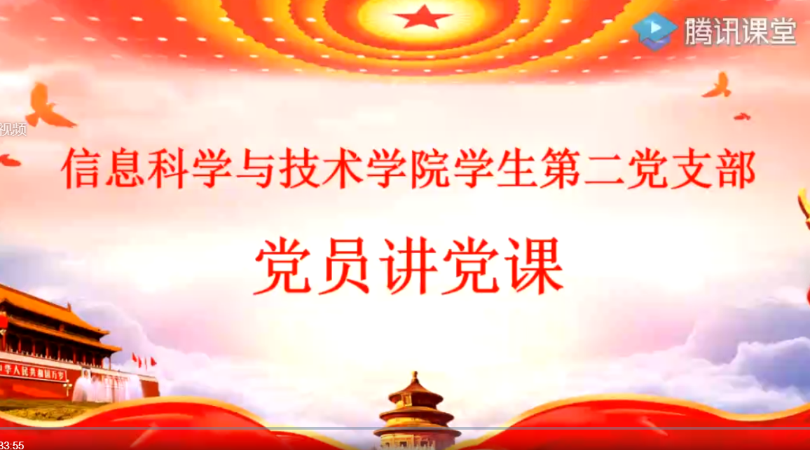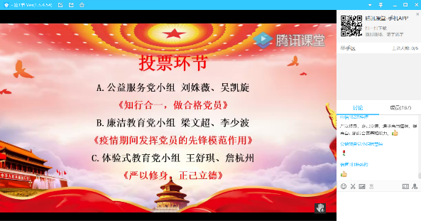 为了切实做到“党的课程上线、党的活动在线、党员意识不离线”,进一步落实以“云”育人党建工作,我院学生第二党支部把党的组织生活搬上云端,于2020年4月30日利用腾讯课堂开展主题为“点亮思想,擦亮形象”的“党员讲党课”比赛党日活动。支部书记邓艳桃、副书记田旭峰,全体党员及积极分子全员参与。