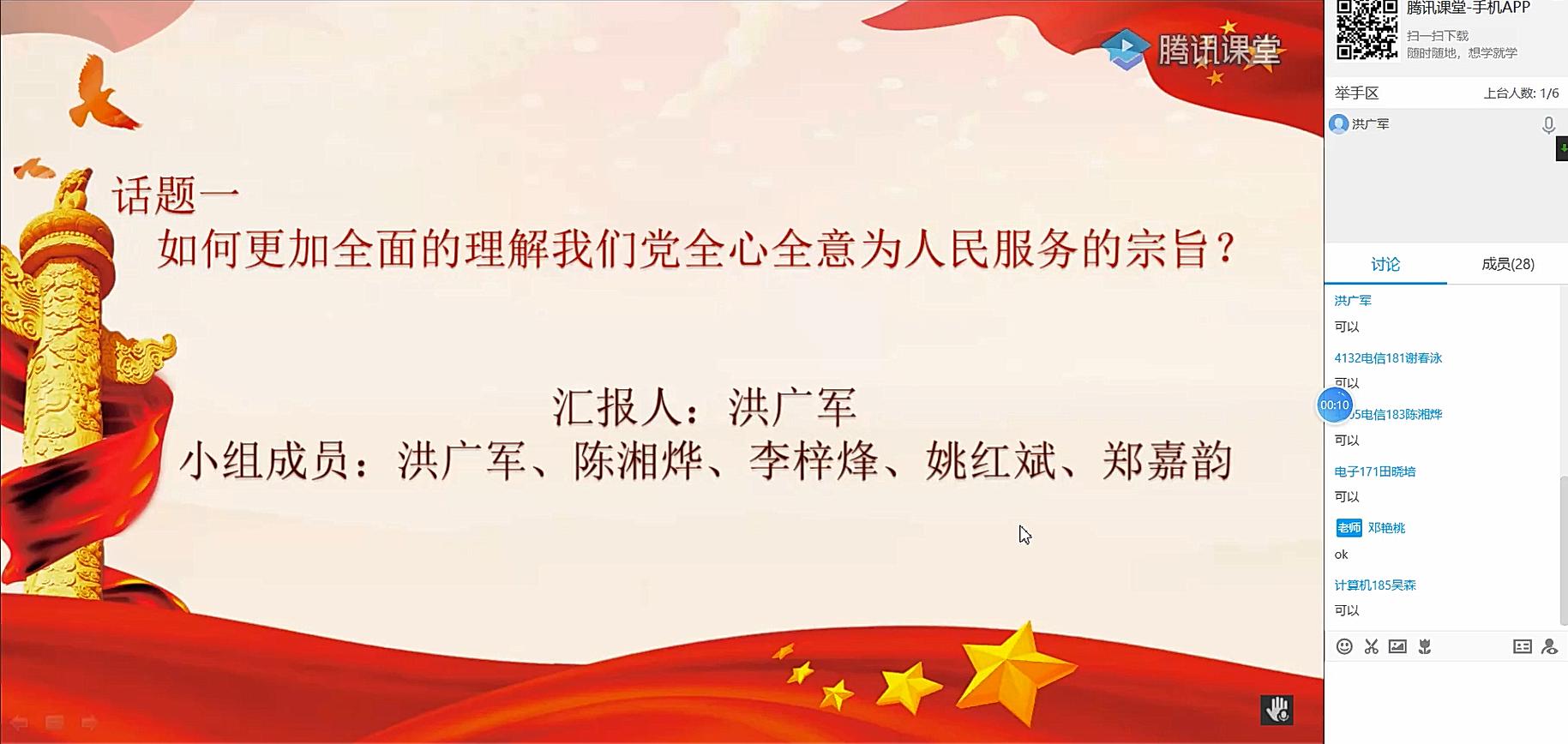 35名党员发展对象分成7组分别就“如何更加全面的理解我们党全心全意为人民服务的宗旨”、“疫情期间,青年应该如何更好地发挥五四精神”、“作为一名大学生党员,应该如何更好地树立党员带头先锋模范作用”、“当代青年应该如何做到在真学真信中坚定理想信念”、“红船精神对我们新时代青年的影响,我们应该如何传承这种精神”、“新时代青年如何讲好中国故事”、“为实现中华民族伟大复兴,我们青年大学生应该怎么做”七个话题在腾讯会议展开热烈讨论。
