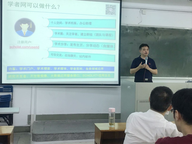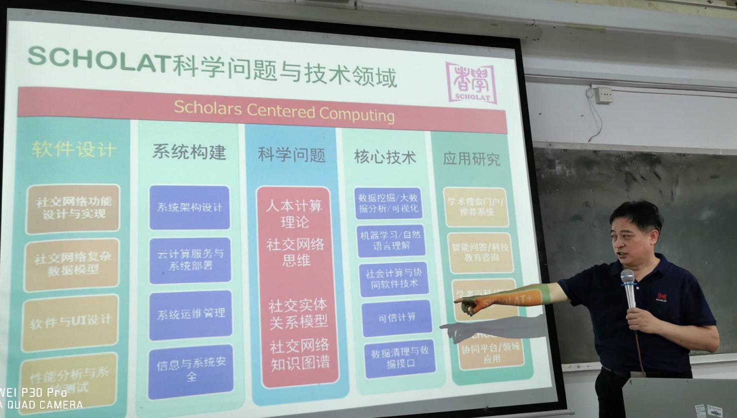 报告以汤庸教授团队自主研发的学术社交网络SCHOLAT(学者网)(http://www.scholat.com)为背景,系统介绍了SCHOLAT社交网络基本架构、教育大数据、人工智能应用实践以及人才培养等,并重点介绍了在学者知识图谱、SCHOLAT+师资队伍定制主页等方面的最新研究进展。