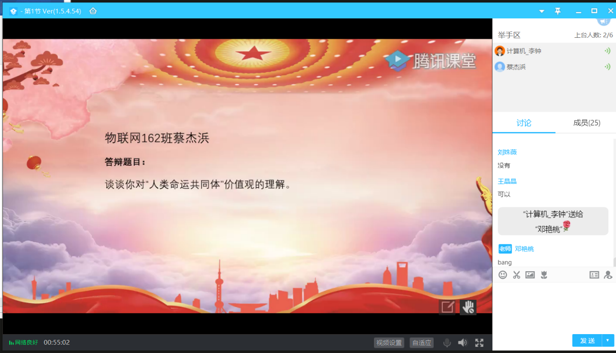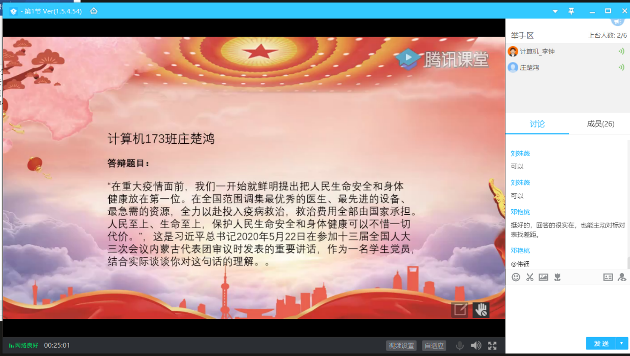 为保证发展党员的质量,真正体现每位党员的意志,我院学生第二党支部于6月16日晚通过腾讯课堂举办预备党员转正答辩会。此次答辩有十三名预备党员参加。参加此次会议的有支部书记邓艳桃老师、支部委员会成员和全体后备支委。会议共一项议程,各转正预备党员就所持答辩题目进行答辩,完成答辩后由支部书记与支委成员组成的答辩小组就转正预备党员答辩情况进行评价。