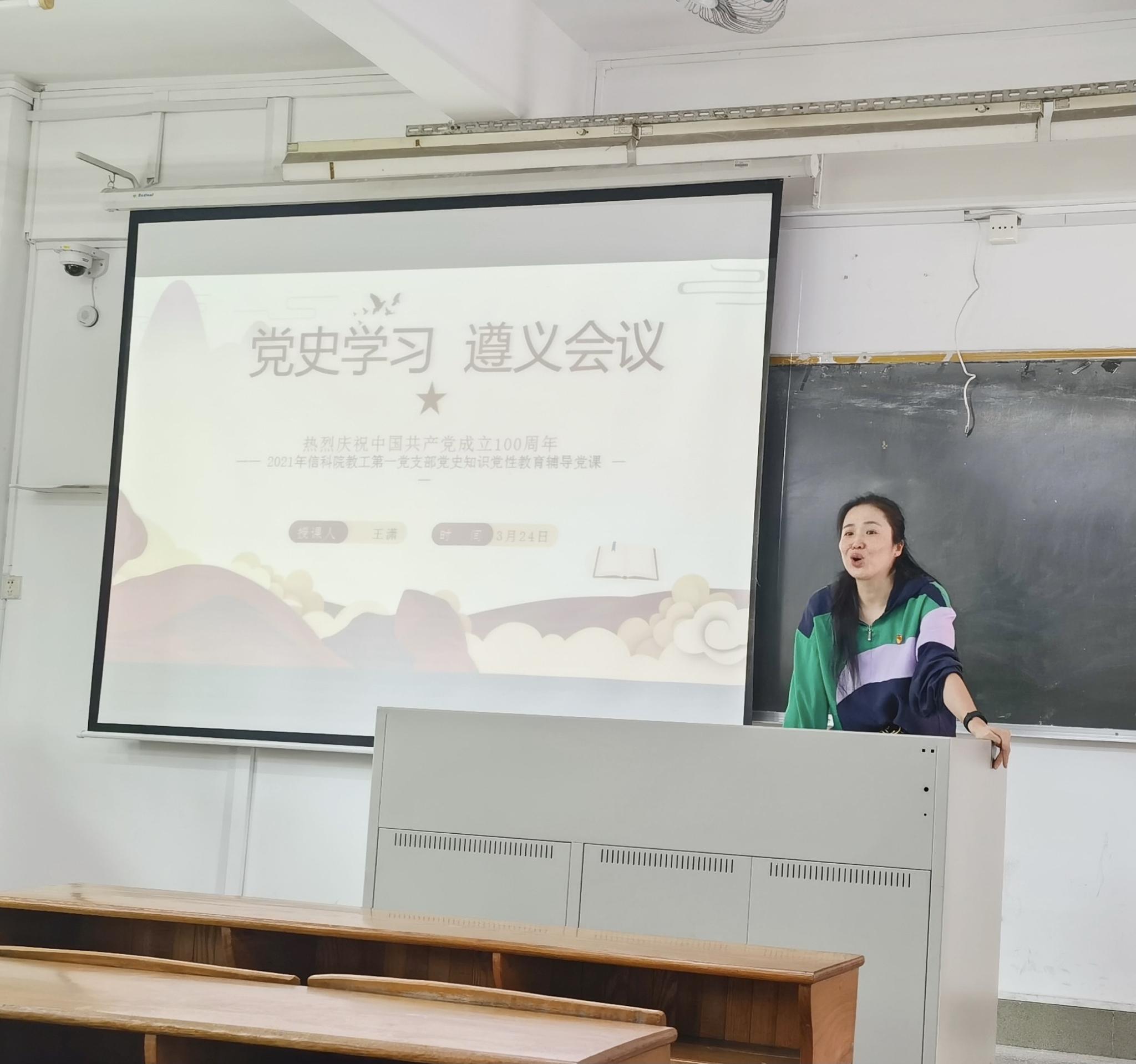 历史是党员最好的教科书,中国革命历史是党员最好的营养剂。为纪念中国共产党建党100周年,贯彻执行学校党委及学院党总支关于党史学习教育的部署。3月24日上午,我院教工第一党支部在教学楼303召开支部党员大会,本次会议是支部2020年党史教育学习活动的启动及动员大会。支部副书记王潇为支部全体党员上了一堂题为“遵义会议与遵义会议精神”的主题党课。此次党课,分别从“历史背景、过程和决议内容、历史地位、精神内涵”四个方面讲述了中国共产党和中国工农红军在伟大的历史转折中的艰辛与无畏,开创了中国共产党独立自主领导中国革命的先河,开启了马克思主义中国化的新征程。让大家从历史和现实两个维度进一步全面深刻地理解遵义会议的重要意义以及遵义会议精神的重要内涵。