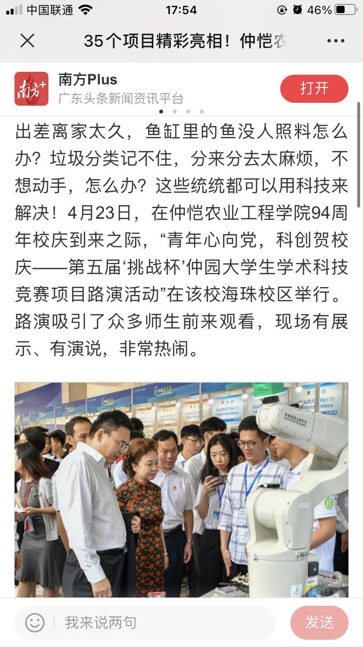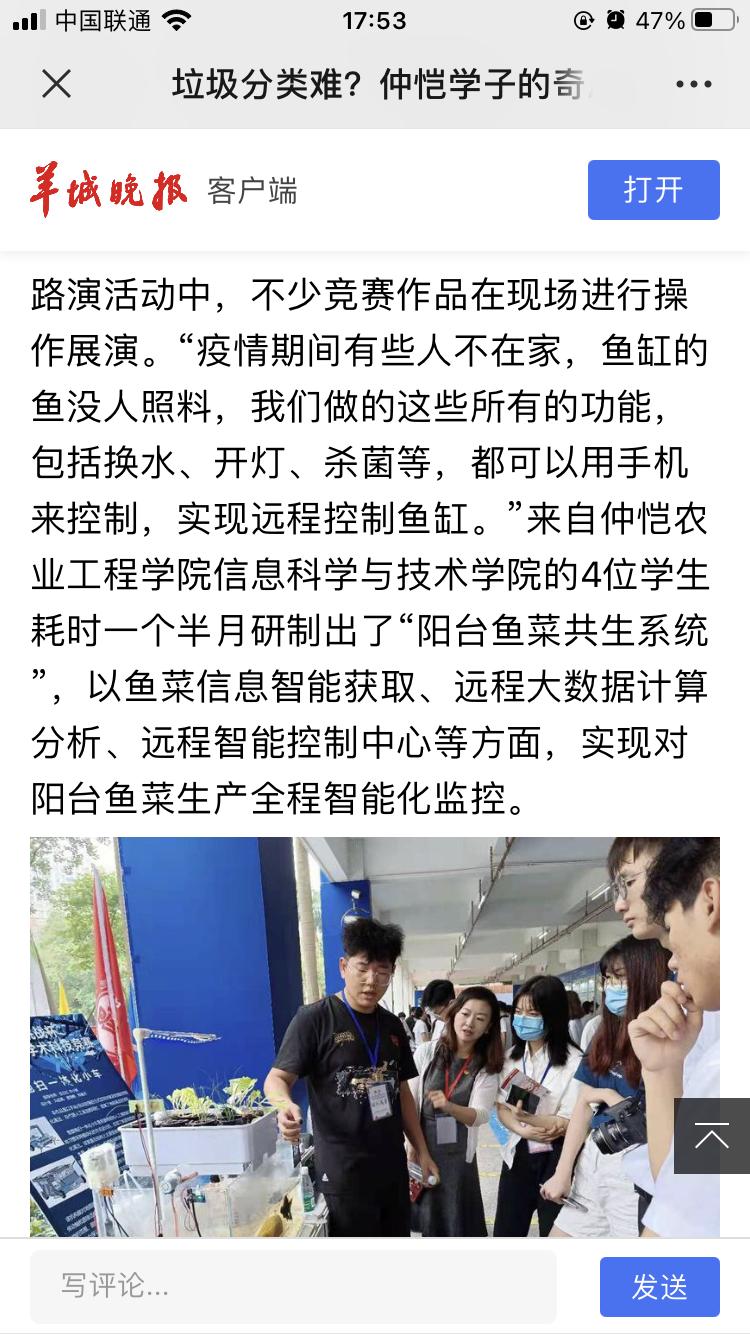 我院获奖项目切合我校农学特色,从实际生活需求出发,兼具实用性和创新性,现场配有专人进行项目讲解,充分展现了我院学子的专业知识和精神风貌。广东南方+、广东科技报和羊城晚报对我院“阳台鱼菜共生系统”、“智能分拣垃圾桶”、“光禽溯源系统”项目进行了宣传报道,并给予了高度评价。