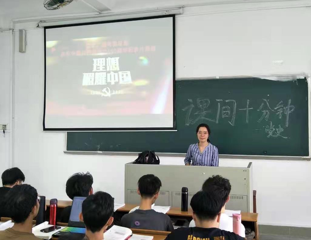为纪念中国共产党建党100周年,激励全体师生党员继承光荣革命传统、发扬党的优良作风,深入贯彻执行学校党委及学院党总支关于党史学习教育的部署,我院教工第一党支部在5月份开展了“课间党史十分钟”活动。支部党员利用课间十分钟的时间为学生播放了有关党史的视频音频资料,如党史短片、红色经典影视片段、红色歌曲等,这些素材形式多样、内容丰富,激发了学生爱党爱国感情,增强了他们的民族自尊心、自信心和自豪感,取得了较好的效果。