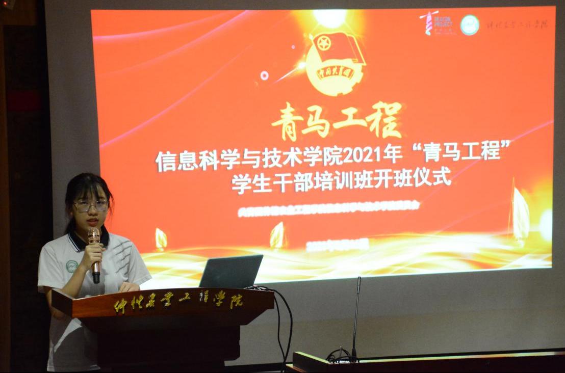 随后,由本期青马班代表吴佳芸进行发言。她首先代表全体学员对领导老师和工作人员表示了衷心的感谢。紧接着,她以中国正处于“两个一百年”奋斗目标的历史交汇区这个大背景,说明了身为信科学子,要以聪明才智贡献国家,以开拓进取服务社会。同时,她结合自身经历,认为加入青马班是一个锻炼和提升自我的平台,最后衷心祝愿青马班各项教育计划顺利开展。