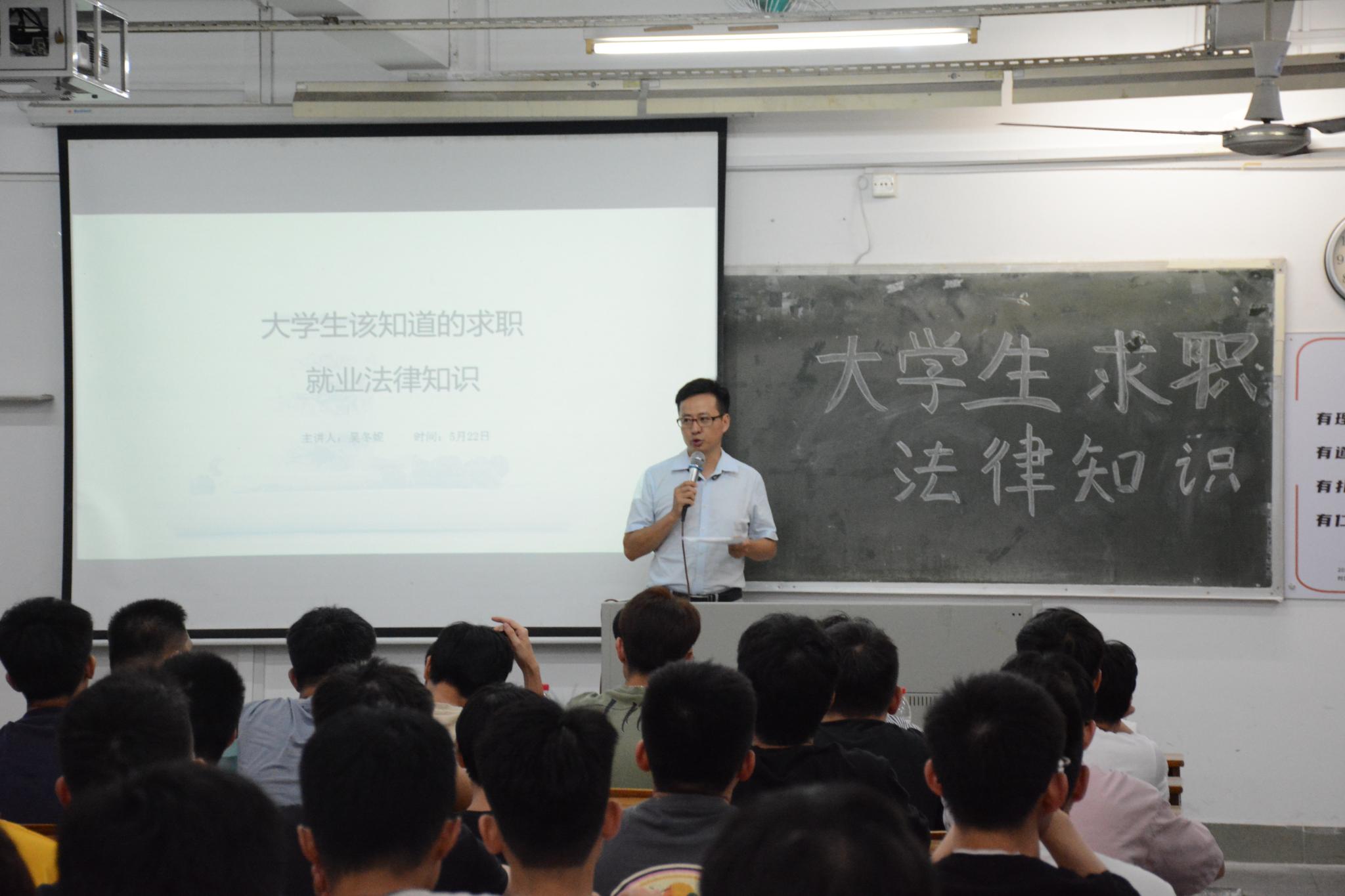 为增强大学生法律意识,提高大学毕业生运用法律维护自身合法权益的能力,我院于5月22日下午7点于海珠校区教学楼309开展大学生求职就业法律知识讲座,此次专题讲座邀请了某大型教育集团助理总裁兼法务部总经理吴律师主讲,学院毕业班辅导员、团委书记吴南生参加并主持,2017、2018级近130名学生参加此次讲座。