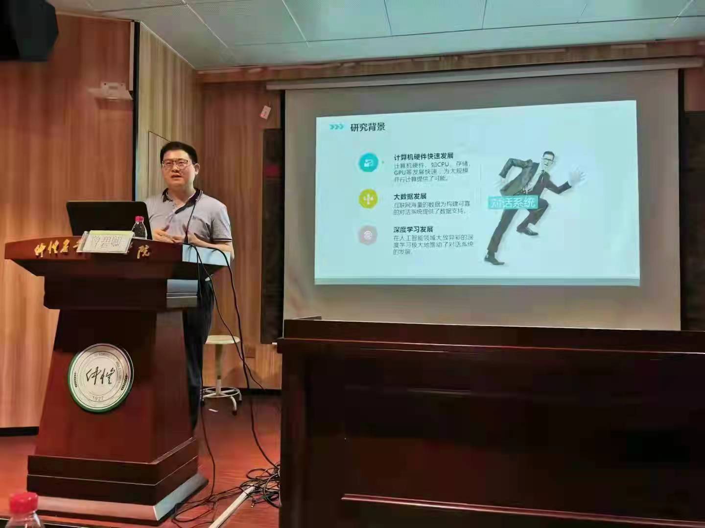 研究生报告结束后,由两位校外专家带来学科前沿学术报告,首先是华南师范大学曾碧卿教授的《自然语言处理中对话系统的研究与实践》,该报告在自然语言处理研究背景、研究现状的基础上,介绍了自然语言处理对话系统的技术原理及应用,包括模块化的对话系统、端到端的对话系统,以及深度学习方法在自然语言处理中的实践应用。最后,建议研究生深入研究《数学之美》,帮助研究生如何快速入门自然语言处理。