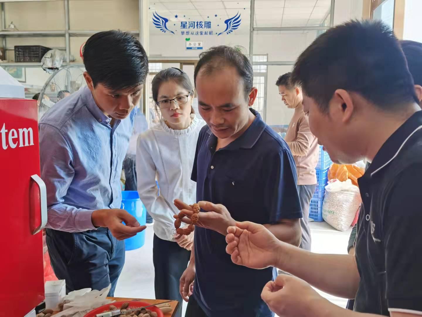 29日上午,专家团队在罗定市科技局叶金生副局长、叶杰科长等人的陪同下,与罗镜镇刘家奇镇长、以及分管农业的镇领导、相关企业技术人员进行座谈,并先后深入绿稻生态农业科技有限公司、泷龙米业生产基地、星河核雕调研数字农业、水稻种植、黑榄核雕产业发展现状。在调研过程中,专家团队针对水稻石灰喷洒问题、黑核橄榄品种、嫁接及育苗等问题,提出了亟需大棚智慧育苗、无人机石灰喷洒并加强黑核橄榄嫁接技术研发等意见。