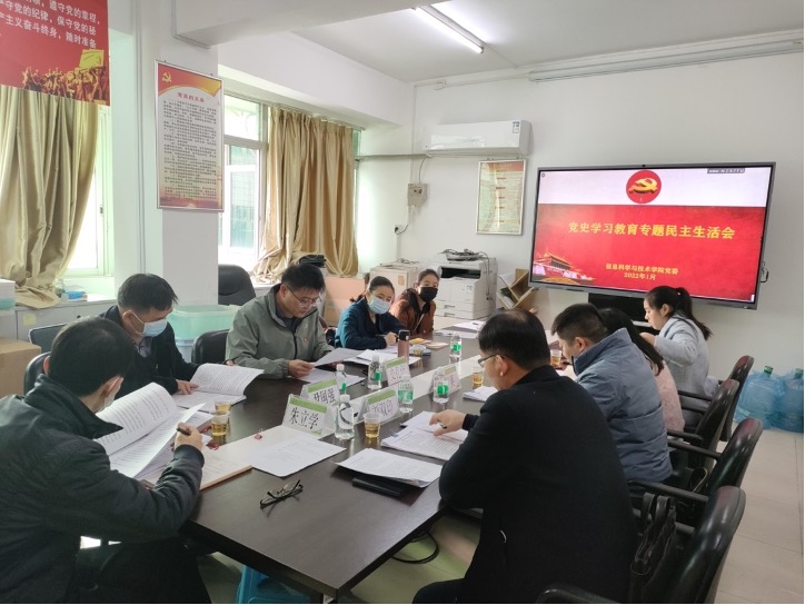 为了进一步增强学院领导班子和党员领导干部“四个意识”、坚定“四个自信”、做到“两个维护”,确保全党步调一致向前;进一步树立居安思危、知危图安风险意识,增强斗争意识、丰富斗争经验、提升斗争本领,坚定信心、保持定力、勇毅前进,走好新的赶考之路;进一步深刻认识党的性质宗旨,践行以人民为中心的发展思想,以更优异的成绩迎接二十大的召开,按照工作安排,我院党委于2022年1月19日下午在行政楼312举行党史学习教育专题民主生活会。学校党委常委、副校长朱立学,专题民主生活会督导组成员、设备处处长尹国强,学院领导班子、专职组织员、党支部书记、办公室主任等出席会议。会议由史孔仕主持。