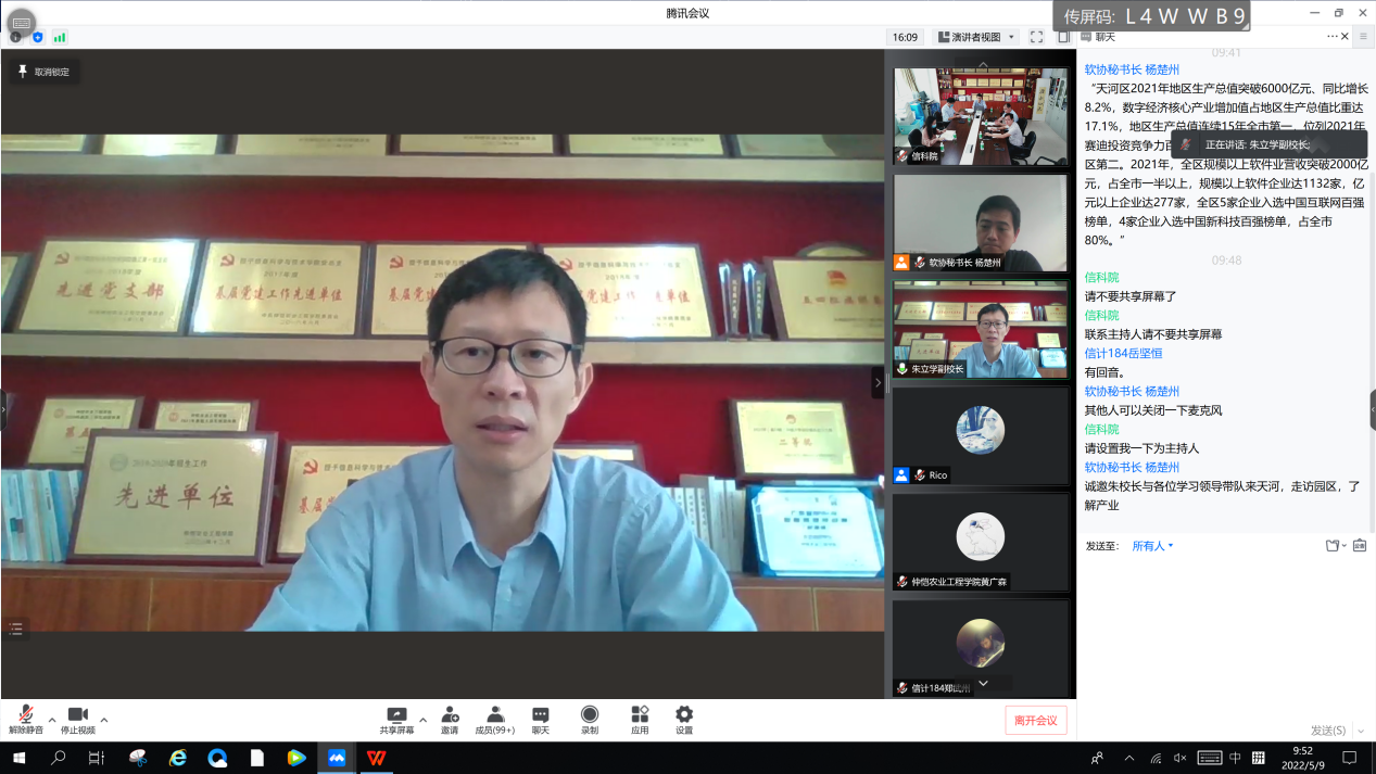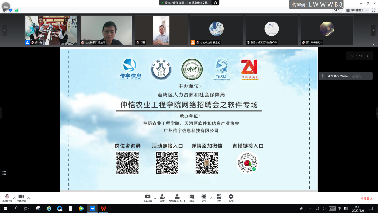 5月9日上午,开幕仪式以线上的形式在腾讯会议举行,参加人员有仲恺农业工程学院副校长朱立学,广州市天河软件与信息产业协会秘书长杨楚州,学生处副处长昌灯圣、信息科学与技术学院院长刘双印、党委副书记史孔仕、计算科学学院党委副书记郭肖明、自动化学院党委副书记黄毅和负责就业的辅导员以及2018级部分毕业生,会议由史孔仕主持。