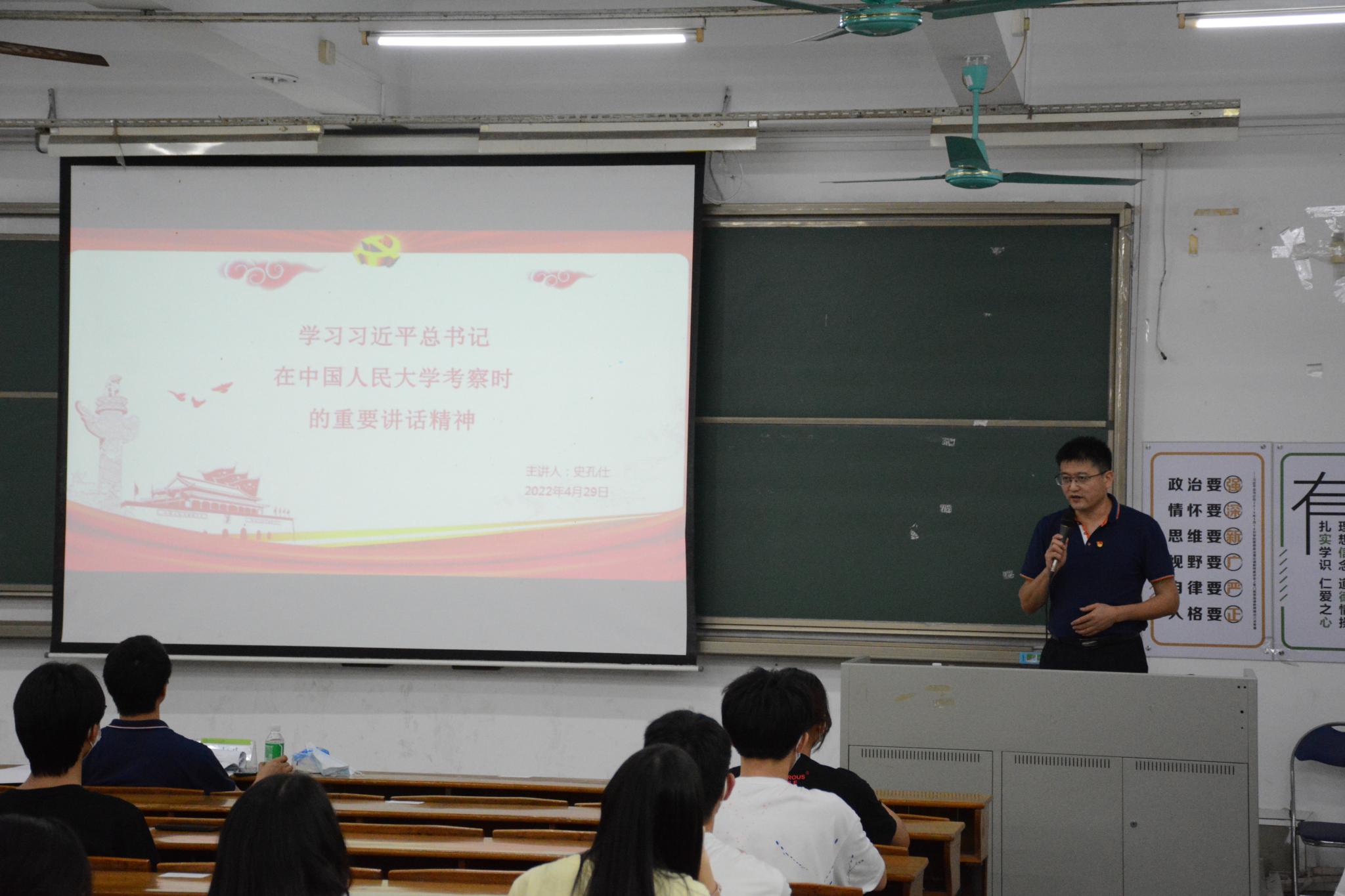 会上,史孔仕领学习近平总书记重要讲话精神,宣讲习近平总书记重要讲话的丰富内涵、精神实质和重大意义。他指出,习近平总书记在五四青年节即将到来之际,在4月25日来到中国人民大学考察调研并发表重要讲话,充分体现了党中央对教育事业一以贯之的高度重视,对广大教师和青年学生的亲切关怀、殷切期望。习近平总书记强调,广大青年要做社会主义核心价值观的坚定信仰者、积极传播者、模范践行者,向英雄学习、向前辈学习、向榜样学习,争做堪当民族复兴重任的时代新人。