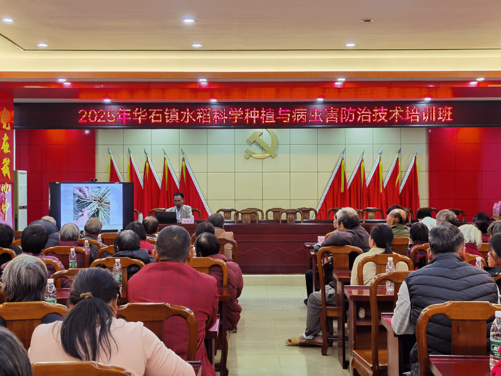 近日,华石镇部分稻田因病虫害影响出现减产,对农户收入造成实际损失。获悉该情况后,驻镇帮镇扶村工作队与仲恺农业工程学院农村科技特派员团队高度重视,迅速协调资源,由特派员团队高学凯老师特邀水稻专家唐辉武教授进行专题培训。20251127日下午,双方联合举办的“2025年华石镇水稻科学种植与病虫害防治技术培训班”正式开班,谢彩健、刘岳等老师共同参与,吸引了全镇80余户水稻种植户踊跃参加。