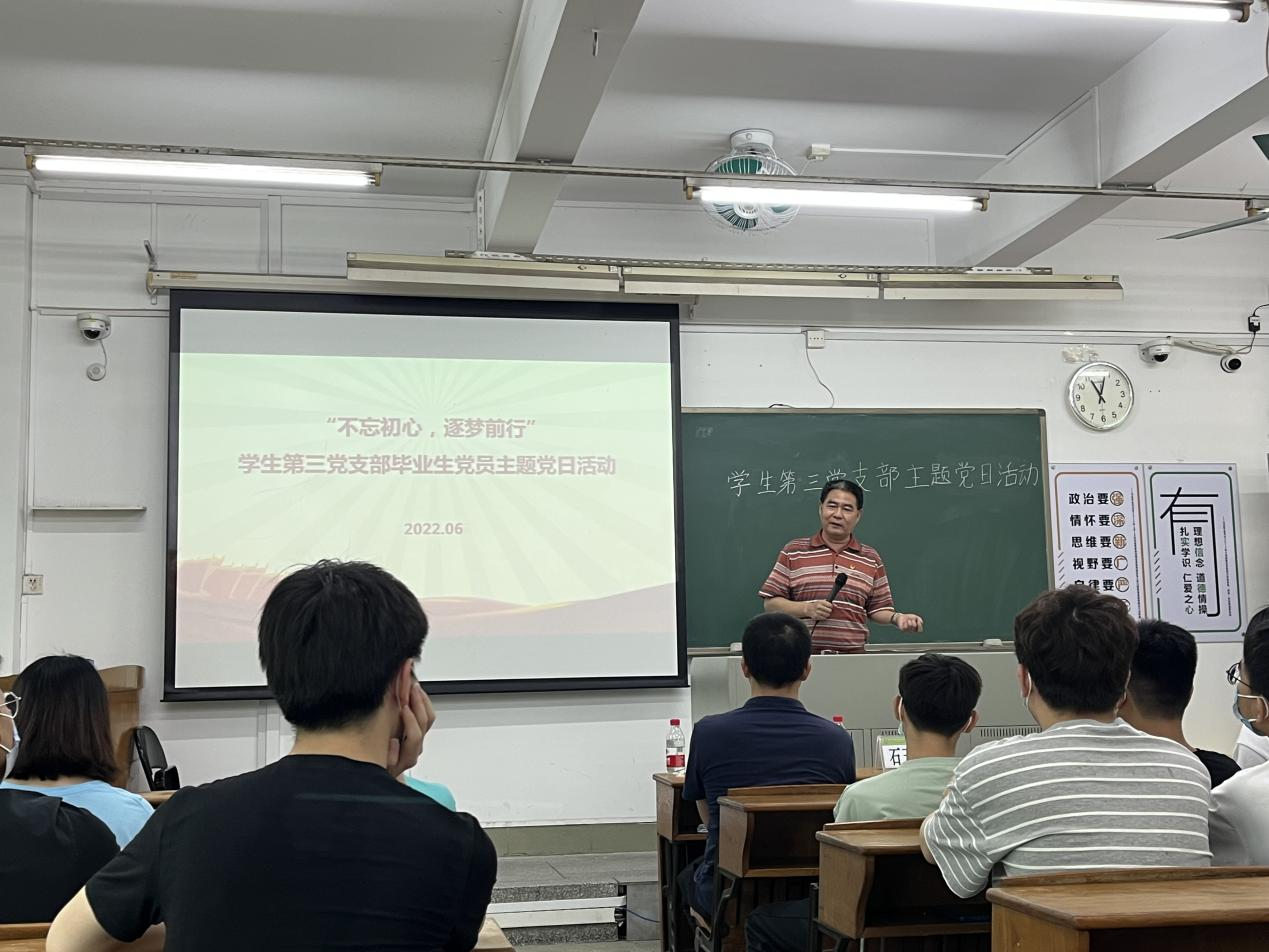6月17日上午,在毕业生即将离校之际,我院学生第三党支部在教学楼304举办“不忘初心,逐梦前行”毕业生主题党日活动。学校党委委员、教务处处长石玉强、信息科学与技术学院党委副书记史孔仕及学生第三党支部全体党员参加活动,活动由支部书记赵丽主持。
